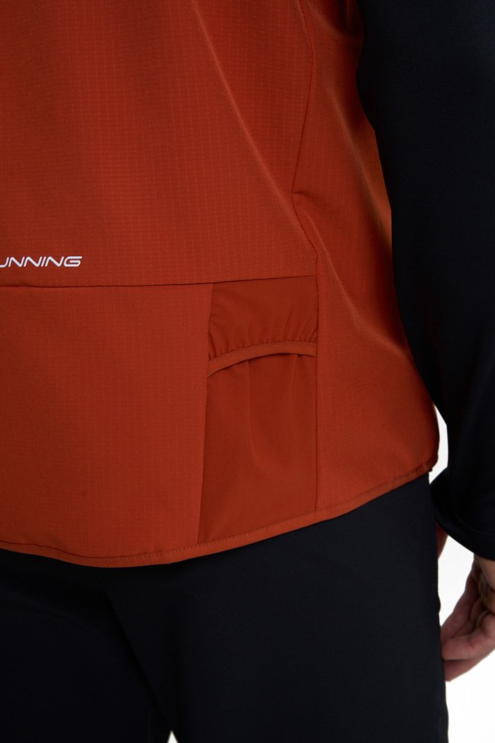 Боковые панели из материала пониженной плотности создают микровентиляцию, способствуя отводу излишков тепла и влаги. Высокий воротник-стойка и молния с мягкой защитой подбородка формируют дополнительный барьер от холода. Предусмотрены два боковых кармана на молнии и специальный компактный карман для геля. Светоотражающие элементы повышают заметность в условиях слабого освещения.