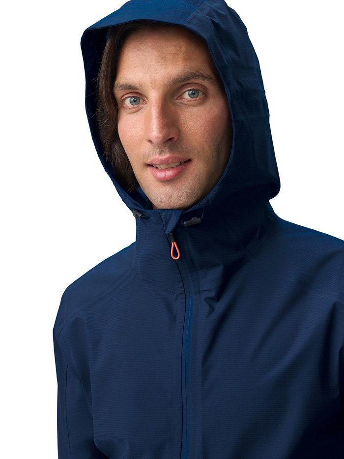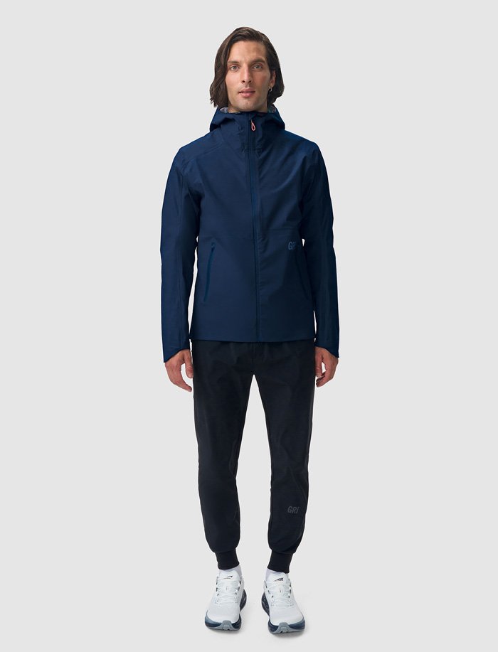 Куртка оснащена водонепроницаемыми молниями и клееными швами, которые исключают промокание даже в сложных погодных условиях. Продуманная конструкция включает боковые карманы, регулируемый нижний край и капюшон с настройкой по бокам и на затылке, что позволяет адаптировать посадку под любые условия и сохранять комфорт во время движения. Светоотражающие элементы спереди и сзади делают тренировки безопаснее в тёмное время суток.