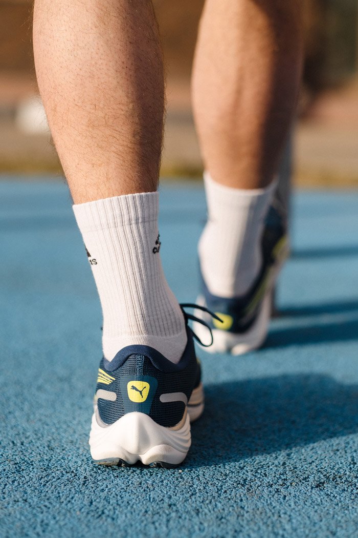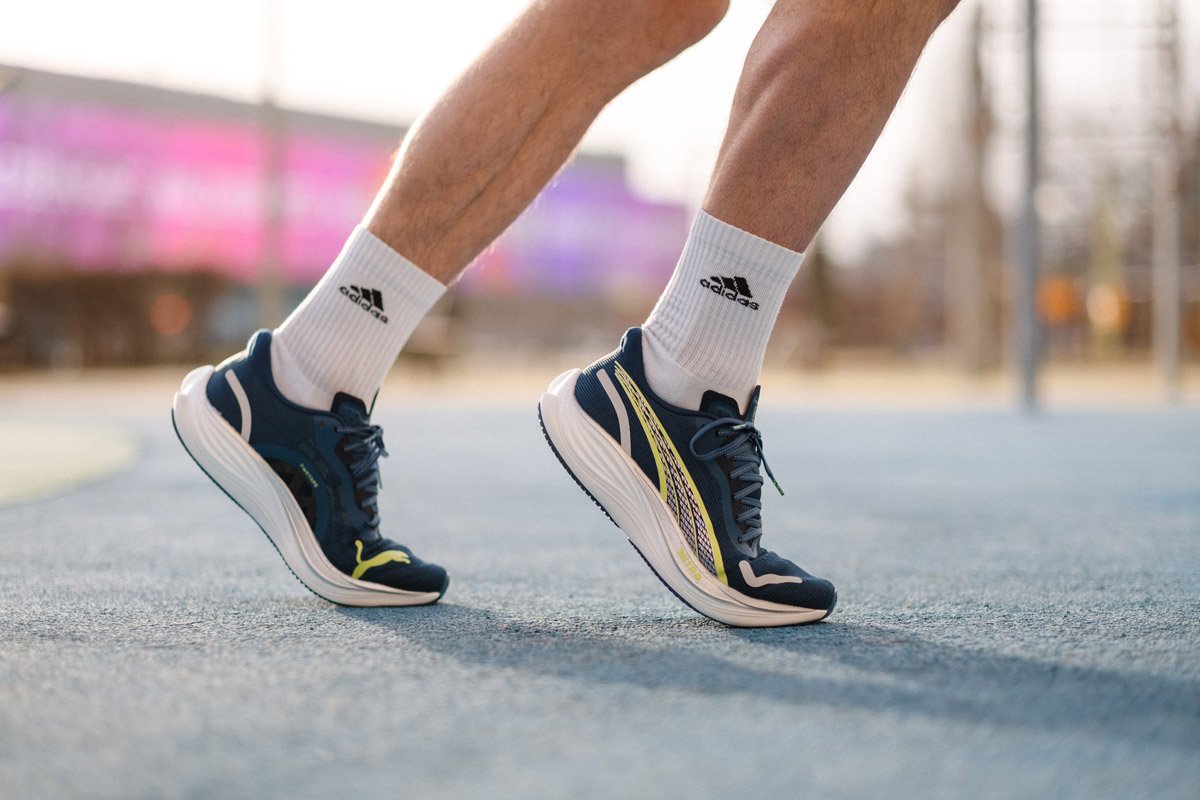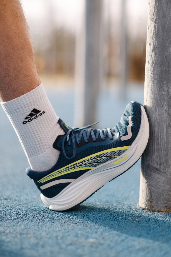 Верх выполнен из инженерной сетки с участками разной плотности для большей воздухопроницаемости и плотного обхвата стопы. Шнуровочная панель усилена ламинирующим покрытием для надежной фиксации. Жесткая эргономичная конструкция пяточного стакана и плотная набивка обеспечивают поддержку ахиллова сухожилия и голеностопа при беге.