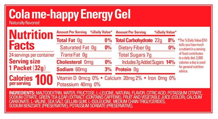 В геле содержатся: углеводы - 22 г, аминокислоты - 450 мг, натрий - 60 мг, калий - 40 мг, кальций - 20 мг. В одном пакетике геля 100 калорий.