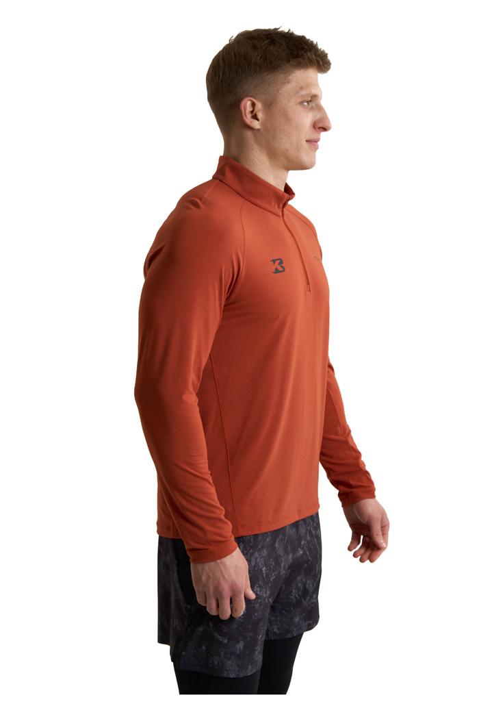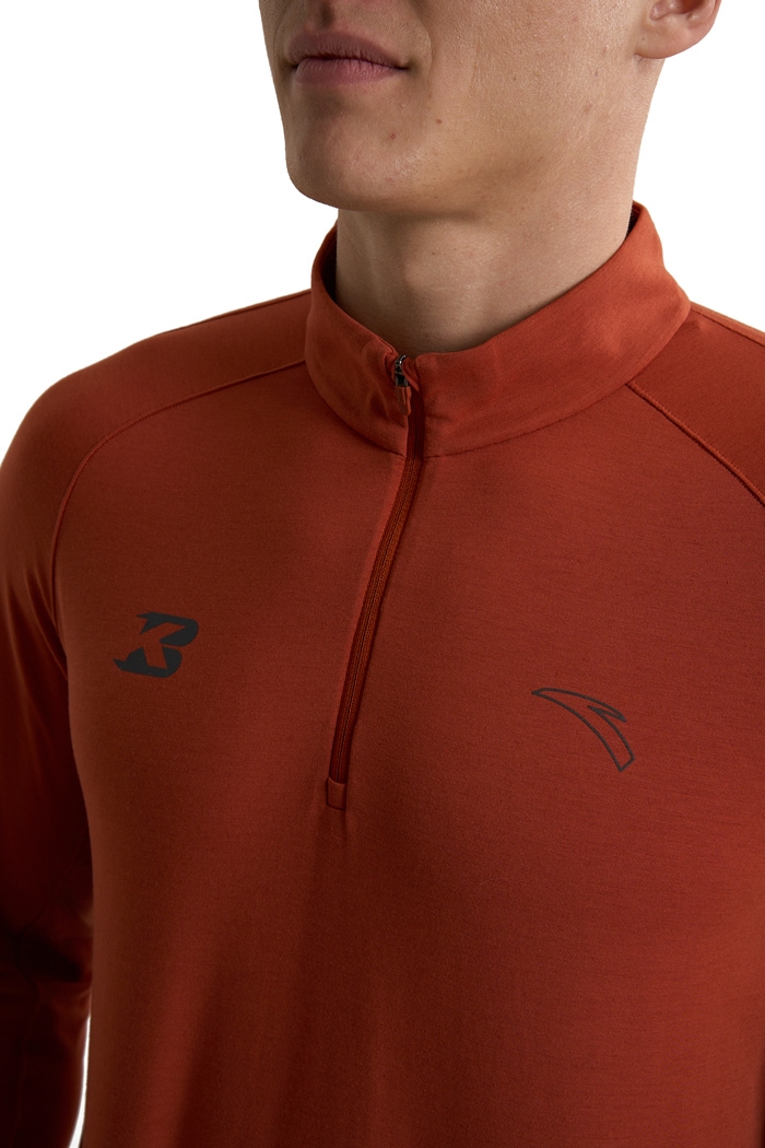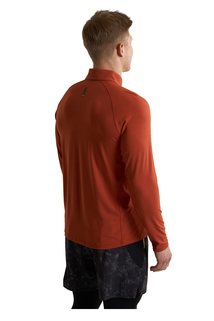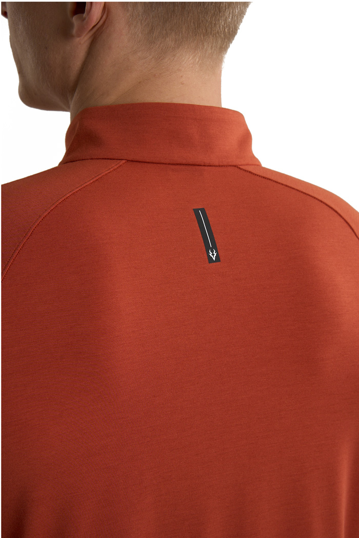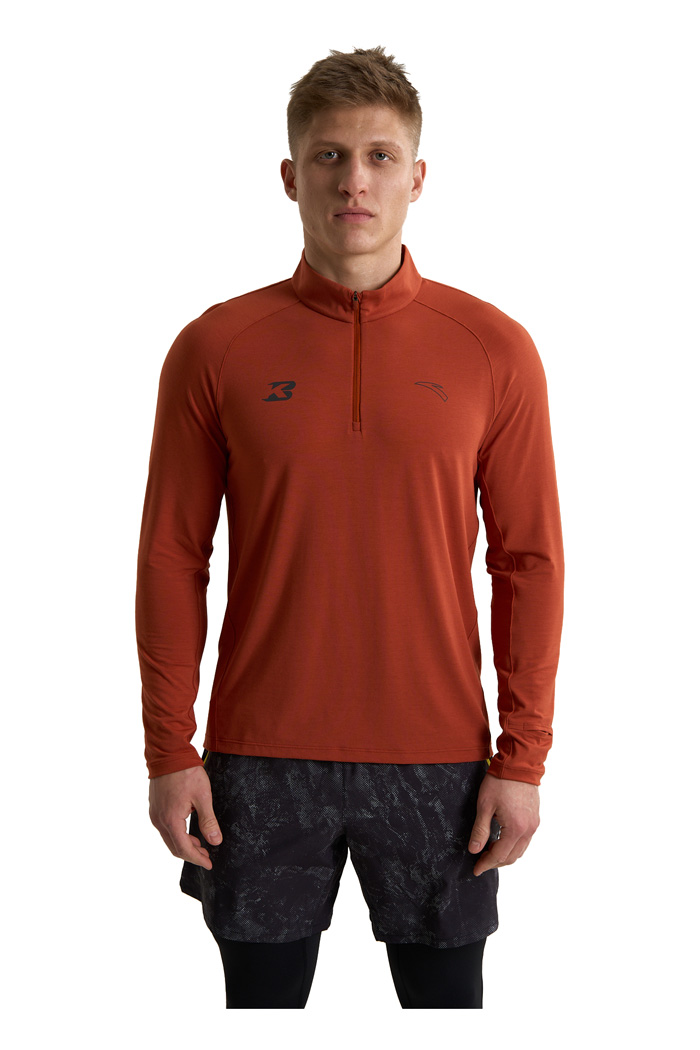 Молния half-zip с мягкой защитой подбородка позволяет быстро регулировать вентиляцию и предотвращает дискомфорт при соприкосновении с кожей. Манжеты с петлями для больших пальцев фиксируют рукава и дополнительно закрывают запястья. Предусмотрена практичная прорезь для часов — удобно контролировать темп, не поднимая рукав. Плоские швы минимизируют риск натирания даже во время длительных пробежек. Световозвращающие элементы на груди и спине повышают заметность в условиях слабого освещения, делая пробежки более безопасными.