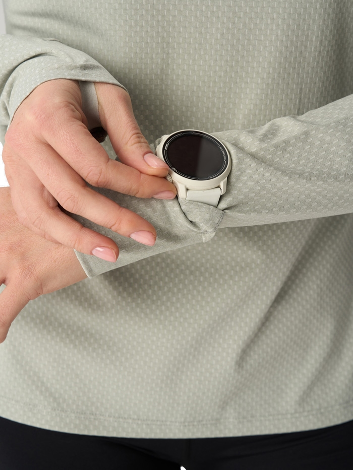 Рукав реглан не сковывает движений, а манжеты с вырезами для больших пальцев защищают кисти от холода. Вырезы для часов на рукавах позволяют отслеживать пульс и время на тренировке, не обнажая запястье. Боковые разрезы добавляют свободы движениям. Светоотражающие элементы повышают безопасность в сумерках и темноте.