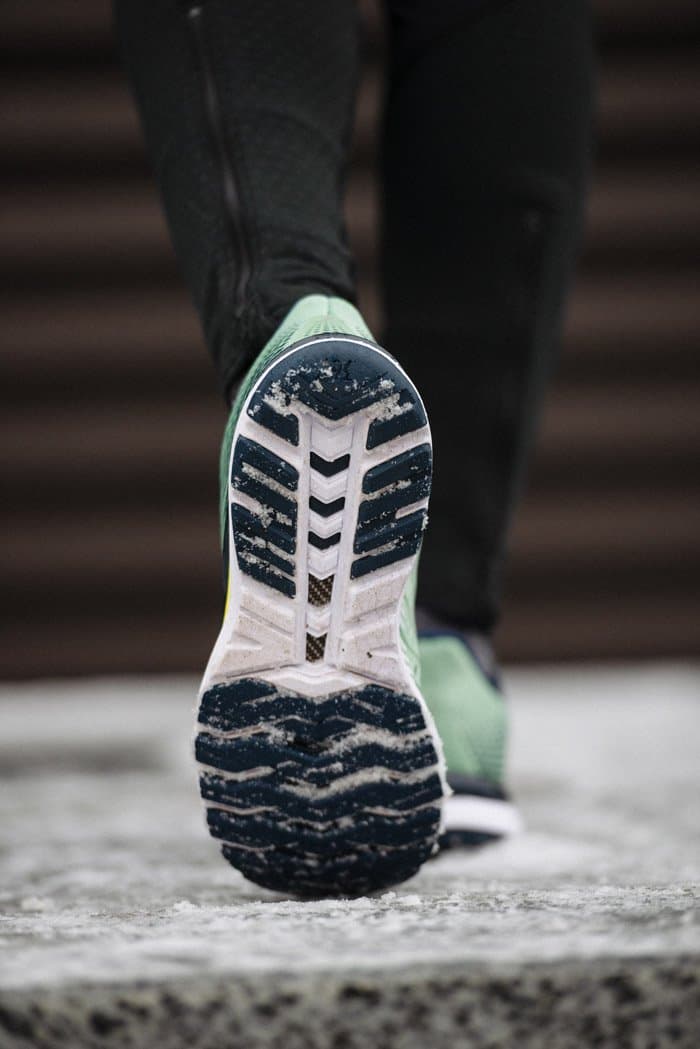 Подошва при приземлении полностью соприкасается с поверхностью для лучшего сцепления и