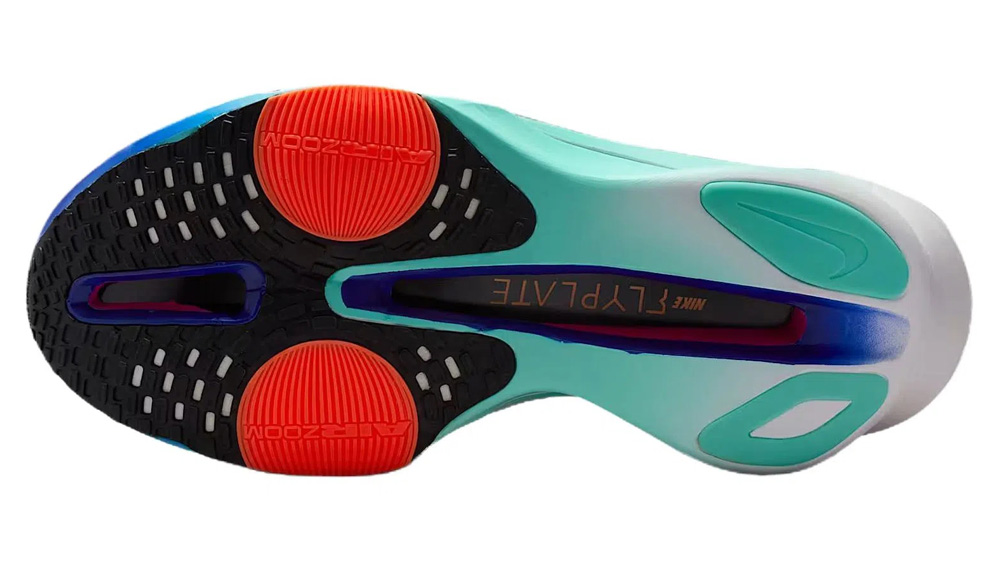 В передней части подошвы расположены две вставки Air Zoom, которые эффективно преобразуют энергию шага в дополнительное ускорение. Промежуточная подошва из сверхлёгкой пены ZoomX обеспечивает исключительную амортизацию при минимальном весе. Карбоновая пластина Flyplate, проходящая по всей длине стопы, стабилизирует движение, усиливает отталкивание и снижает утомляемость мышц. Особая геометрия подошвы способствует плавному перекату и сохранению энергии во время бега.