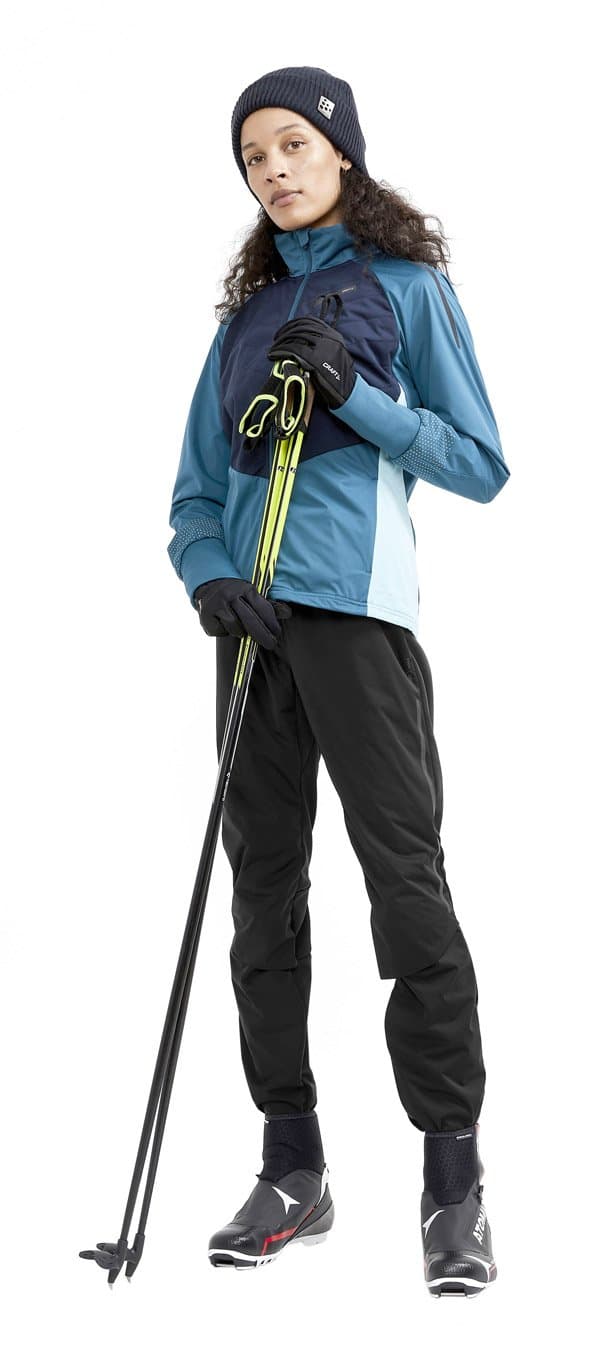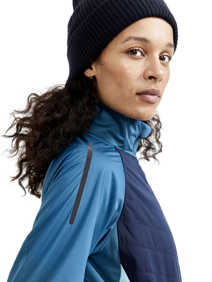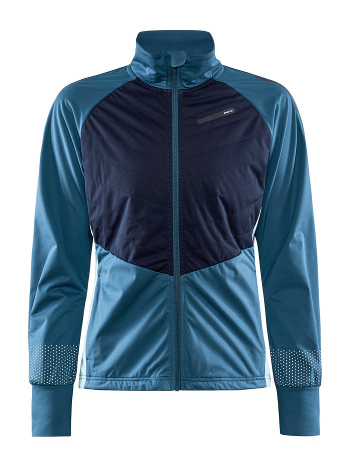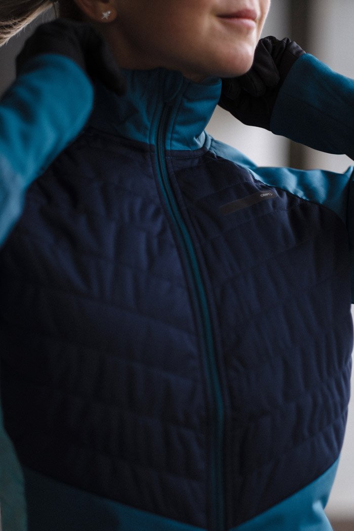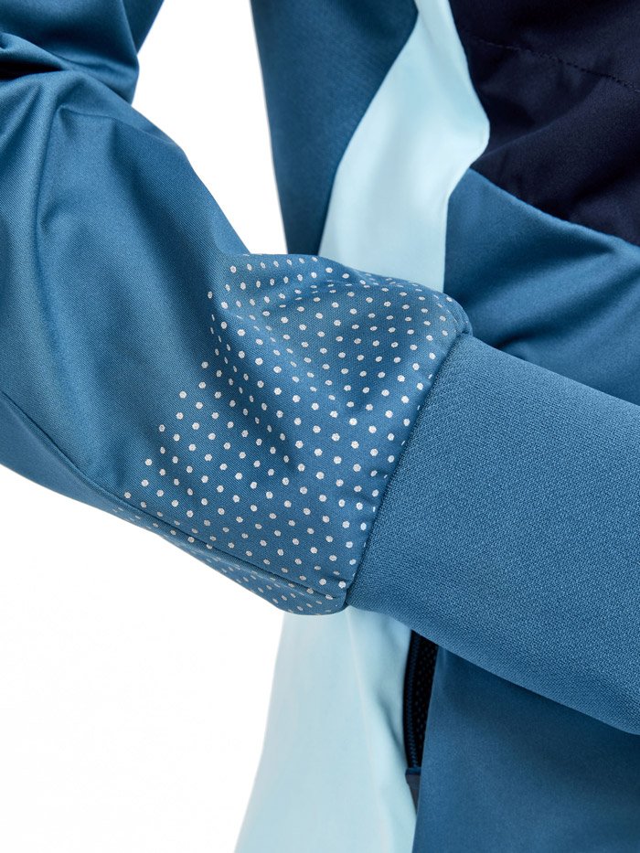 Женская куртка для катания на беговых лыжах и бега в зимний период. Впереди двойная стеганая ткань с утеплителем, поэтому модель великолепно согревает и защищает от ветра и влаги. Задняя часть куртки выполнена из эластичной дышащей ткани с начесом с внутренней стороны.