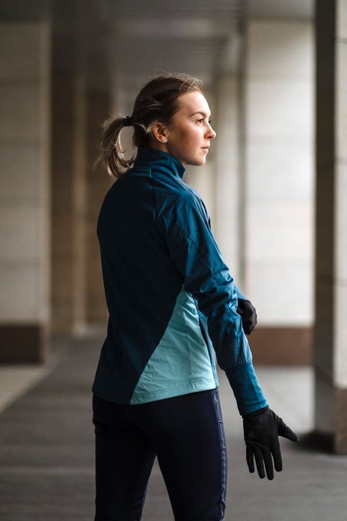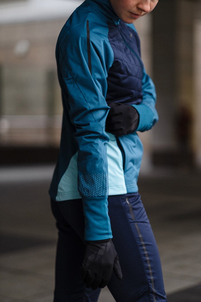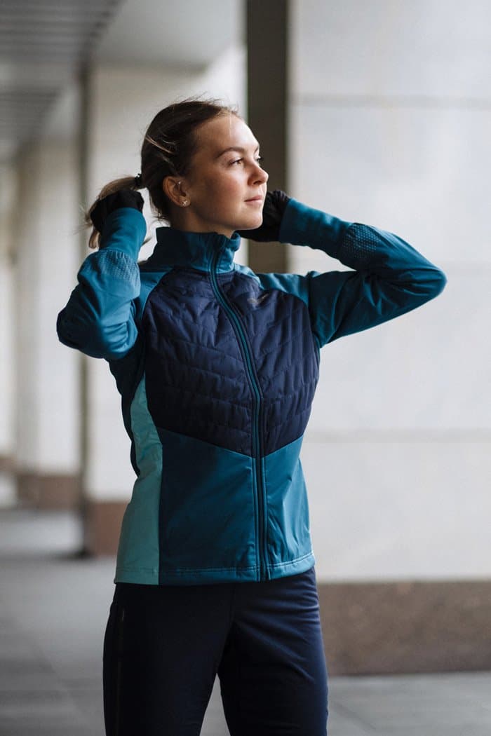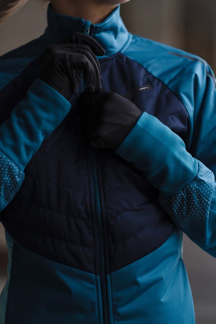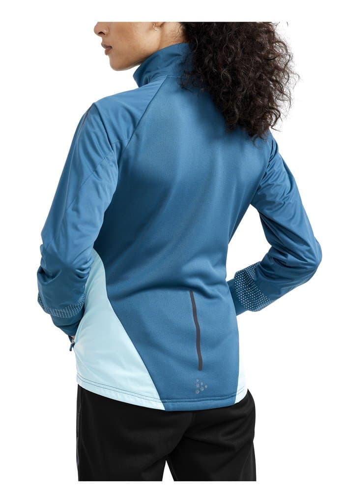 Женская куртка для катания на беговых лыжах и бега в зимний период. Впереди двойная стеганая ткань с утеплителем, поэтому модель великолепно согревает и защищает от ветра и влаги. Задняя часть куртки выполнена из эластичной дышащей ткани с начесом с внутренней стороны.