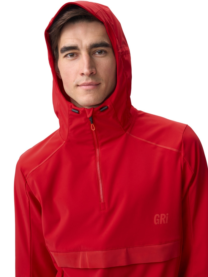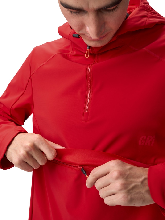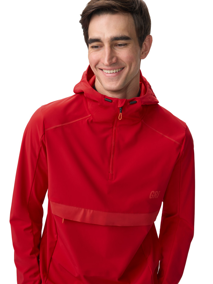 Анорак выполнен из мягкой, бесшумной ткани с мембраной 10000/10000, которая эффективно защищает от ветра и сохраняет комфортную температуру тела, выводя излишнюю влагу наружу. Дополнительная водоотталкивающая DWR-пропитка препятствует впитыванию влаги и снега, сохраняя материал сухим даже при длительных пробежках.