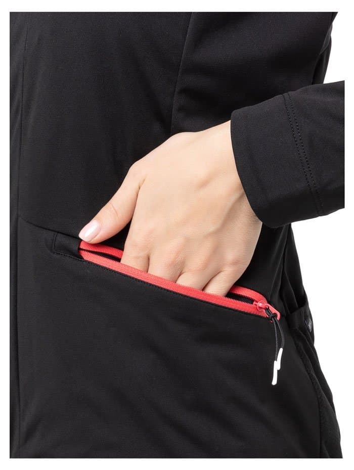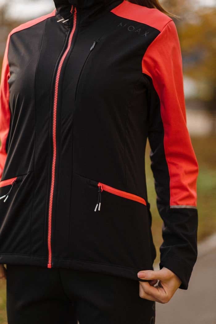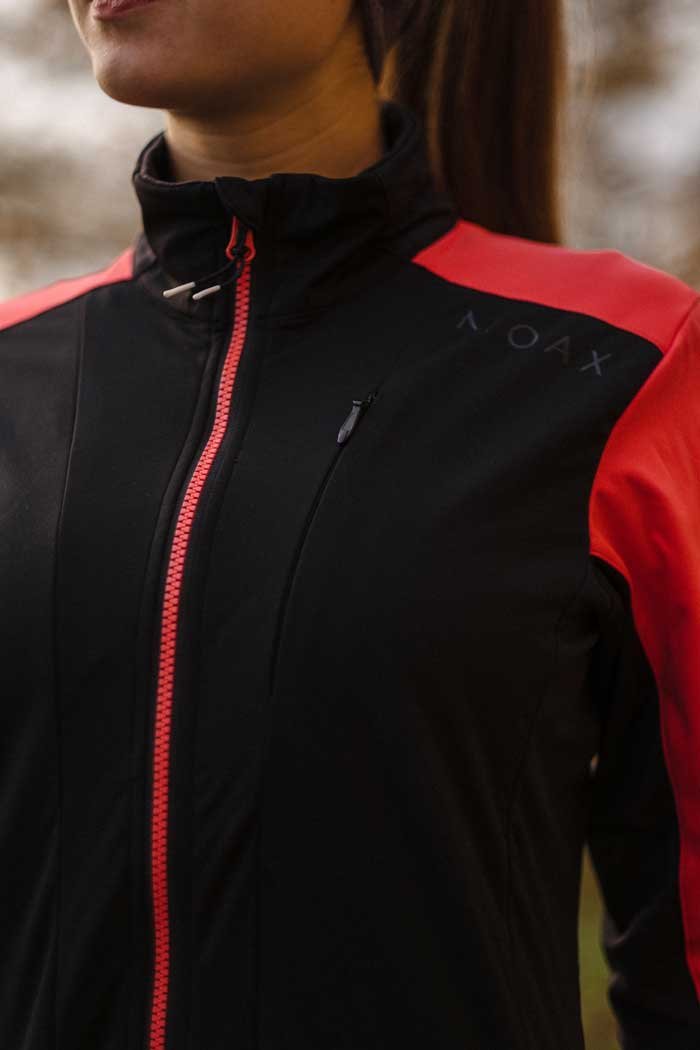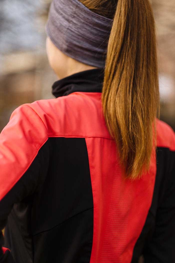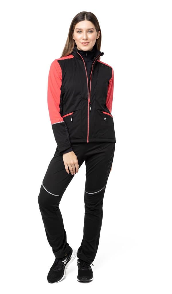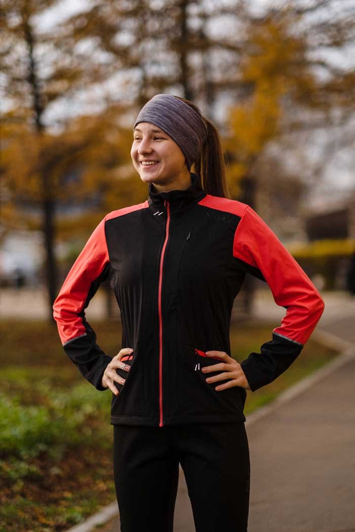 Стильная женская куртка приталенного кроя для тренировок в зимний период года. Модель сшита из функциональной ткани Softshell, превосходно удерживающей тепло и защищающей от ветра. Эластичная спинка выполнена из воздухопроницаемой трикотажной ткани.