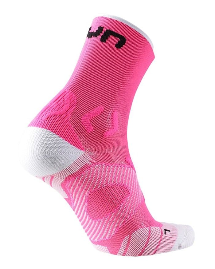 Носки средней длины из трехмерной трикотажной ткани с микроканальной структурой, обеспечивающей охлаждение и воздухообмен. В этой модели использована технология ZeroCuff - она отличается отсутствием манжет, таким образом ничто не препятствует кровообращению, а вероятность отеков снижается. Двойная асимметричная повязка в средней части стопы и в области пятки обеспечивает компрессию и поддержку, кроме того, она хорошо впитывает пот. Стельки анатомической формы предотвращают натирание во время длительных спортивных нагрузок. Трехмерные уплотнения в области пятки смягчают ударную нагрузку на ахиллово сухожилие.