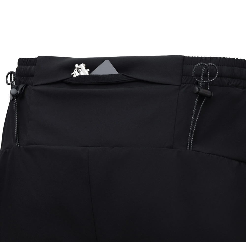Плоский пояс на резинке регулируется шнуром для идеальной посадки. Карман на пояснице предназначен для размещения питания, телефона, карт или ключей. Специальные регулируемые петлички на поясе позволяют закрепить палки для трейлраннинга. Световозвращающие элементы обеспечивают видимость в темное время суток.