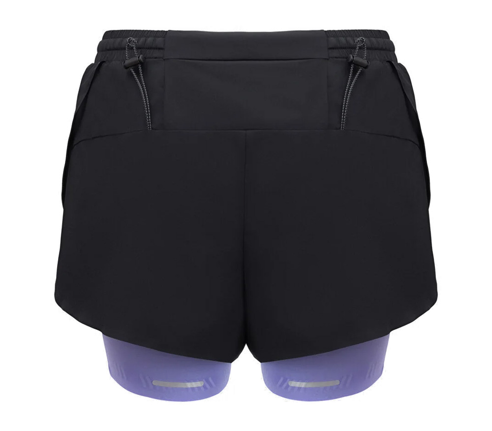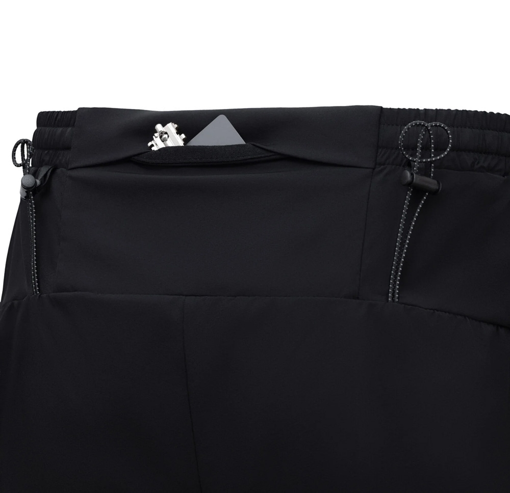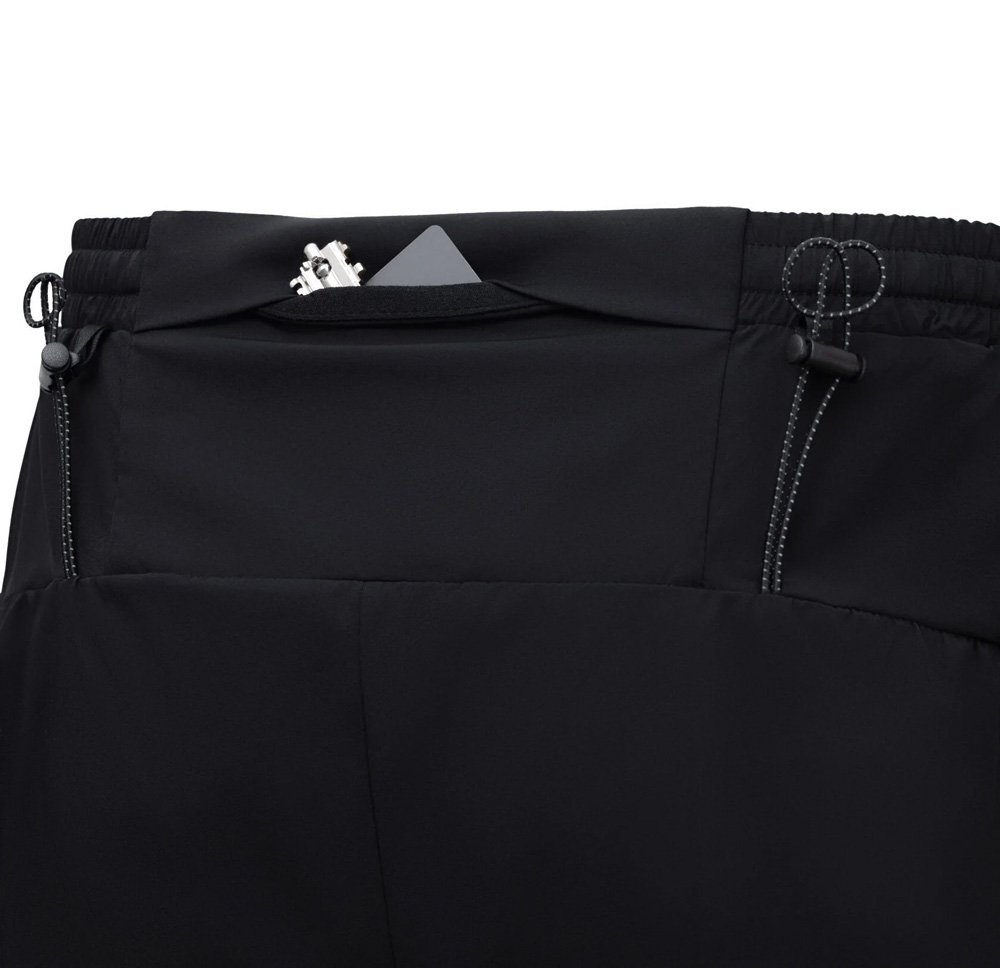 Плоский пояс на резинке регулируется шнуром для идеальной посадки. Карман на пояснице предназначен для размещения питания, телефона, карт или ключей. Специальные регулируемые петлички на поясе позволяют закрепить палки для трейлраннинга. Световозвращающие элементы обеспечивают видимость в темное время суток.