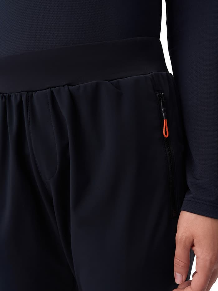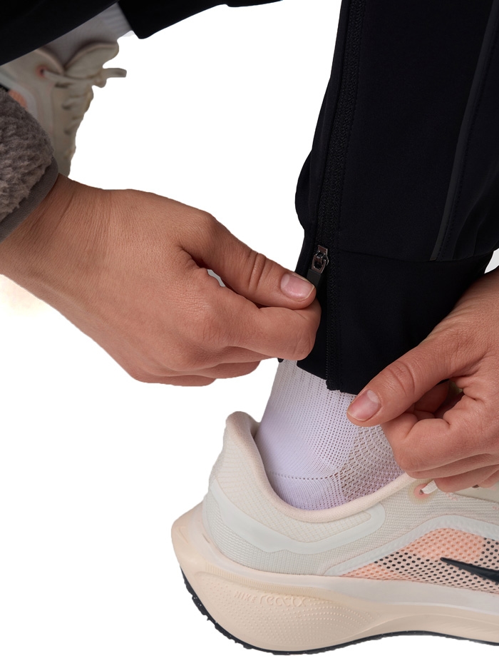 Благодаря продуманным деталям брюки максимально функциональны: манжеты с молниями на штанинах упрощают надевание и снятие, а эластичный пояс с регулировкой позволяет подогнать посадку индивидуально под вас. Боковые карманы с дополнительными сетчатыми отделениями и задний карман на молнии предназначены для удобного хранения мелочей и телефона. Для безопасности в темное время суток на голенях расположены светоотражающие элементы.