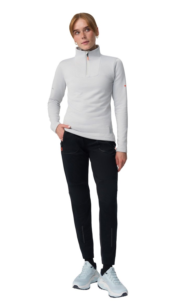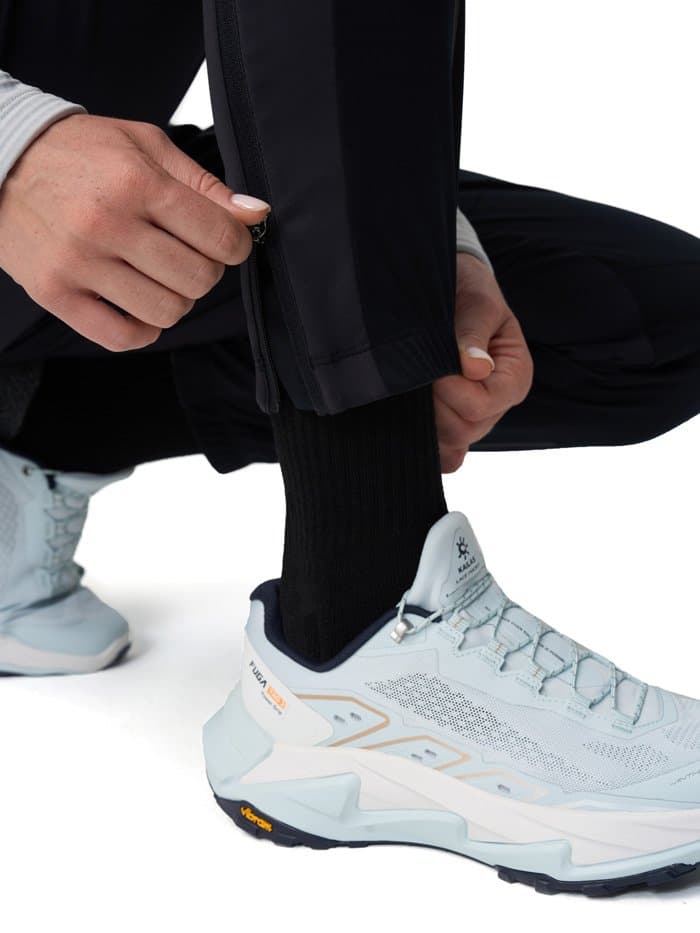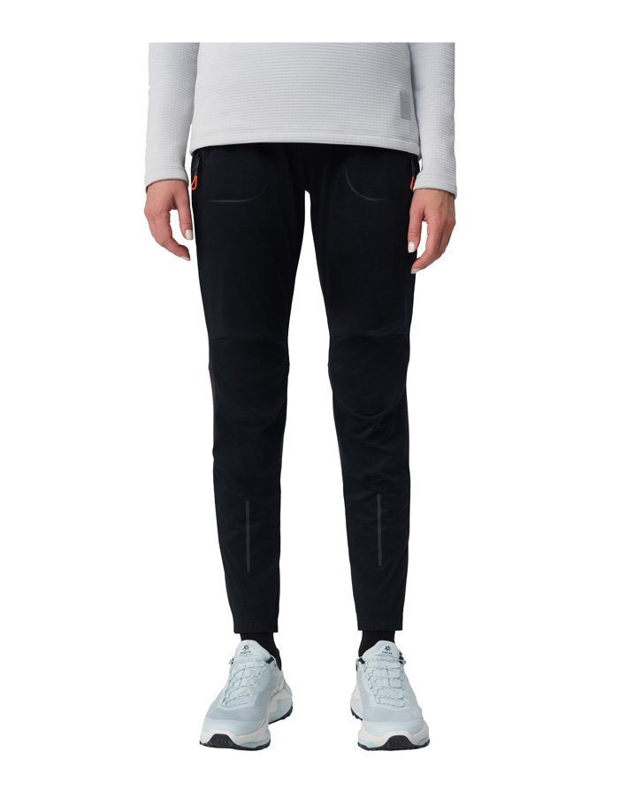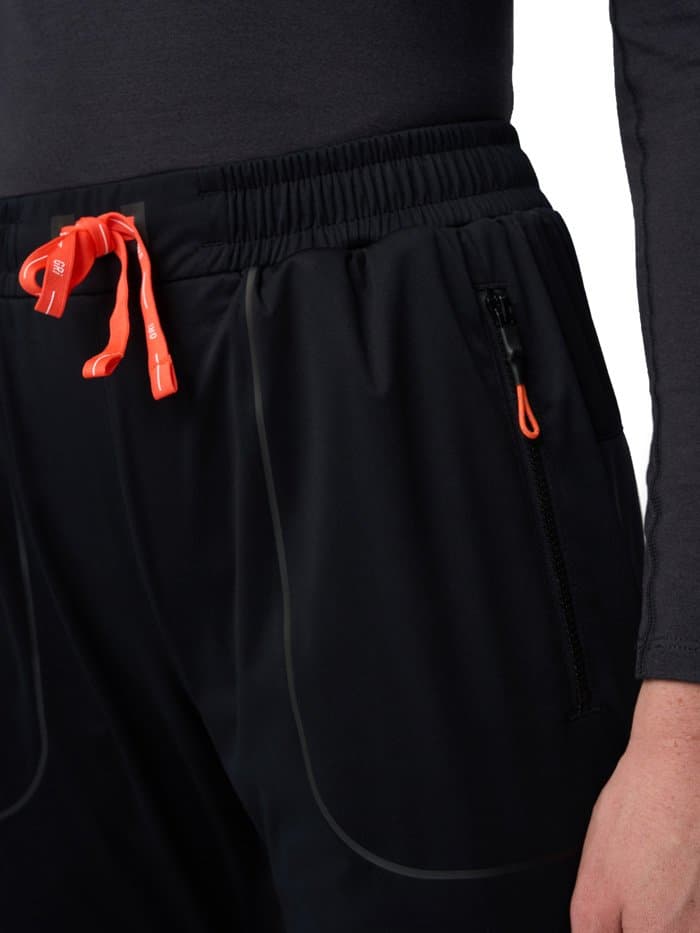 Брюки сшиты из ткани с водоотталкивающей DWR-пропиткой. Передняя часть брюк выполнена из ткани с мембраной 10000/10000, которая отталкивает влагу, сохраняя при этом дышащие свойства. Эластичный пояс оснащен регулирующим шнурком, который позволяет подогнать штаны по фигуре. Штаны оборудованы несколькими удобными карманами на молниях для хранения телефона и мелочей - два сбоку и один сзади.