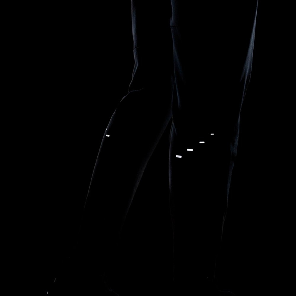 Конический крой с зауженной нижней частью штанин обеспечивает плотную посадку, а молнии на лодыжках позволяют легко снимать и надевать штаны поверх кроссовок. Эластичный пояс оснащен регулирующим шнурком для индивидуальной посадки. Предусмотрены боковые карманы и задний паронепроницаемый карман на молнии для хранения мелочей и телефона. Светоотражающие детали повышают безопасность в условиях низкой освещенности.