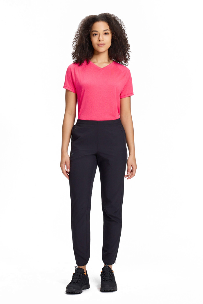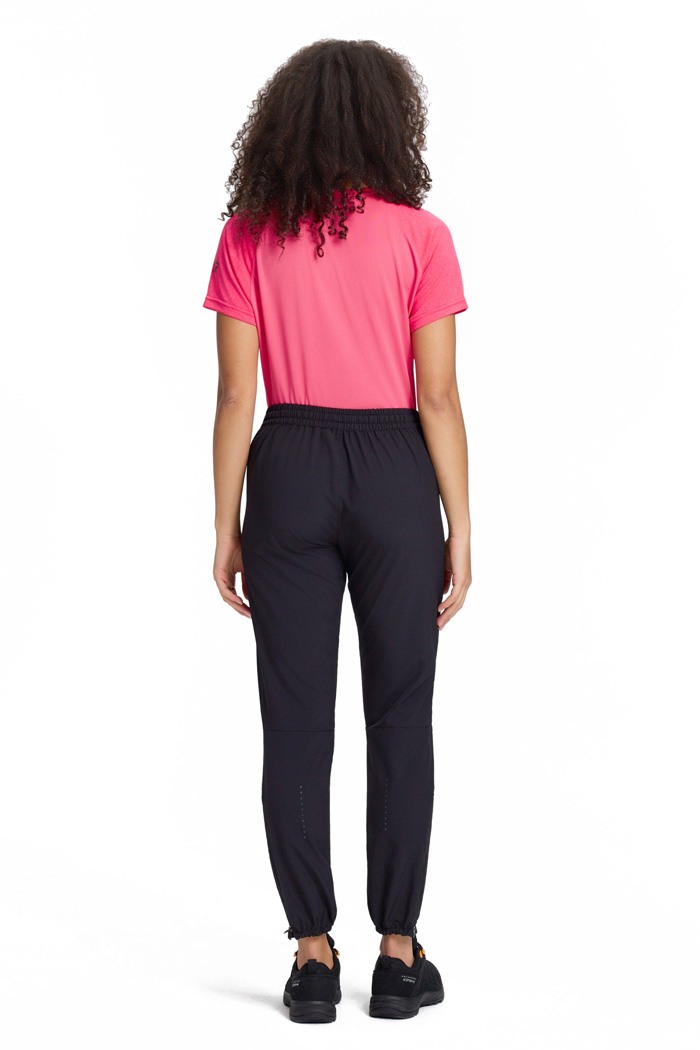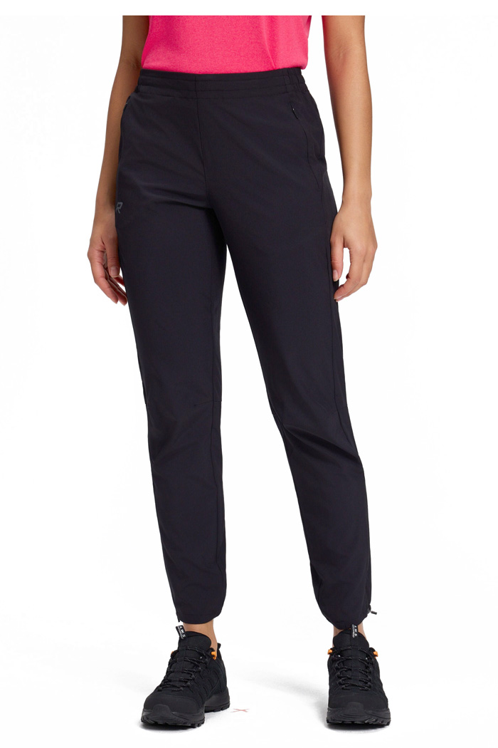 Женские брюки для активного отдыха и повседневных прбежек в любую погоду. Модель отличается стандартным кроем с зауженными штанинами. Они дополнены эластичными манжетами на молниях, позволяющими регулировать ширину и фиксировать штанину поверх обуви. Эластичный пояс со шнурком обеспечивает индивидуальную посадку без лишнего давления.