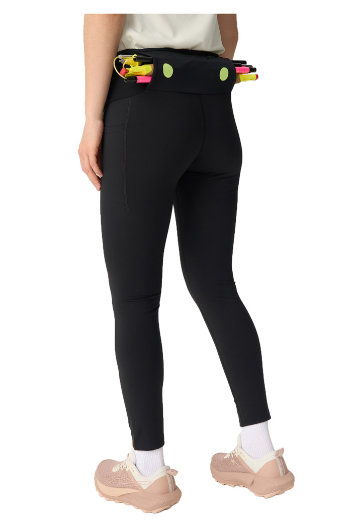 Встроенный трейловый пояс включает два вместительных боковых кармана, карманы из сетки по периметру и задний карман на молнии для телефона. Все они работают как полноценная поясная сумка: сюда поместится фляга, гели и другие необходимые мелочи. Сзади на поясе предусмотрено сквозное отверстие для крепления треккинговых палок или сложенной куртки, а регулировка на поясе позволяет точно настроить посадку.