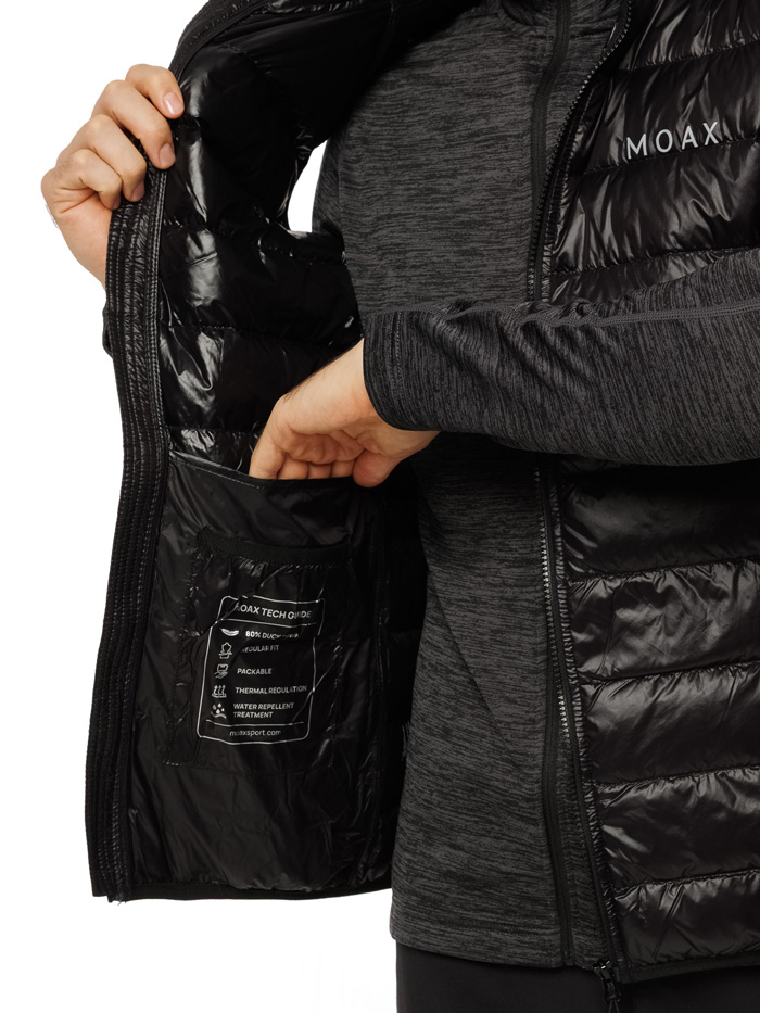 Легкая конструкция обеспечивает свободу движений. Утепленные боковые карманы на молниях позволяют согреть руки и взять с собой все необходимые мелочи. Благодаря компактной структуре жилет легко складывается, что делает его удобным для путешествий и активного отдыха.