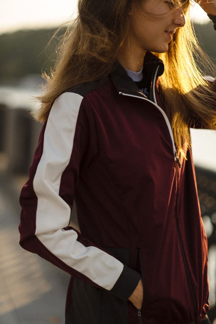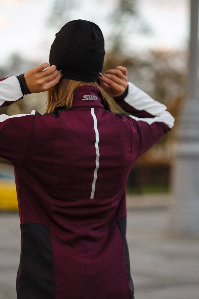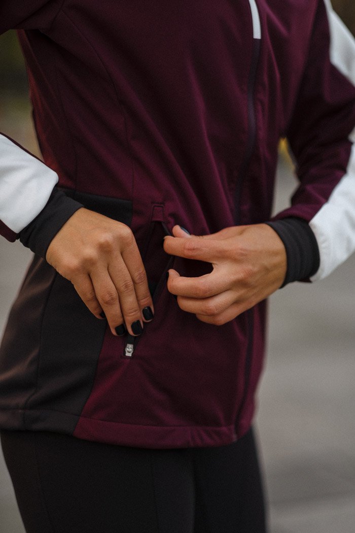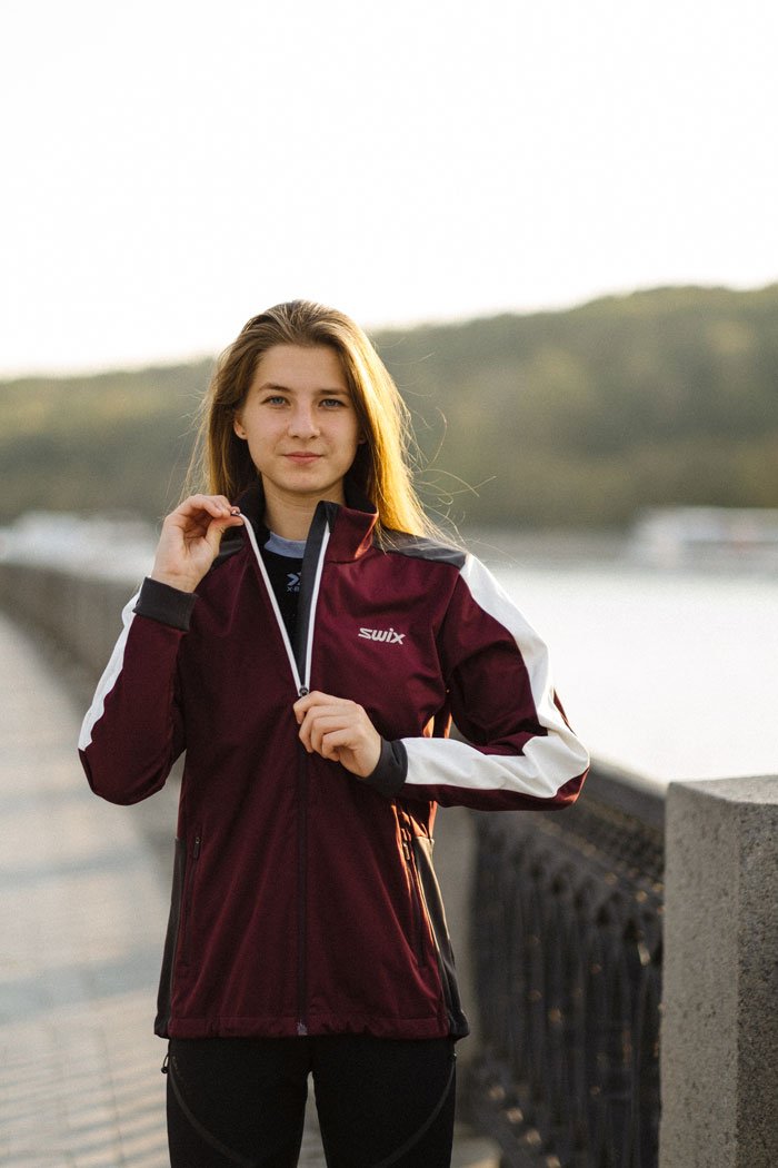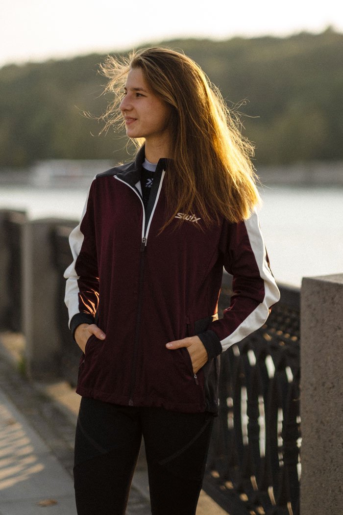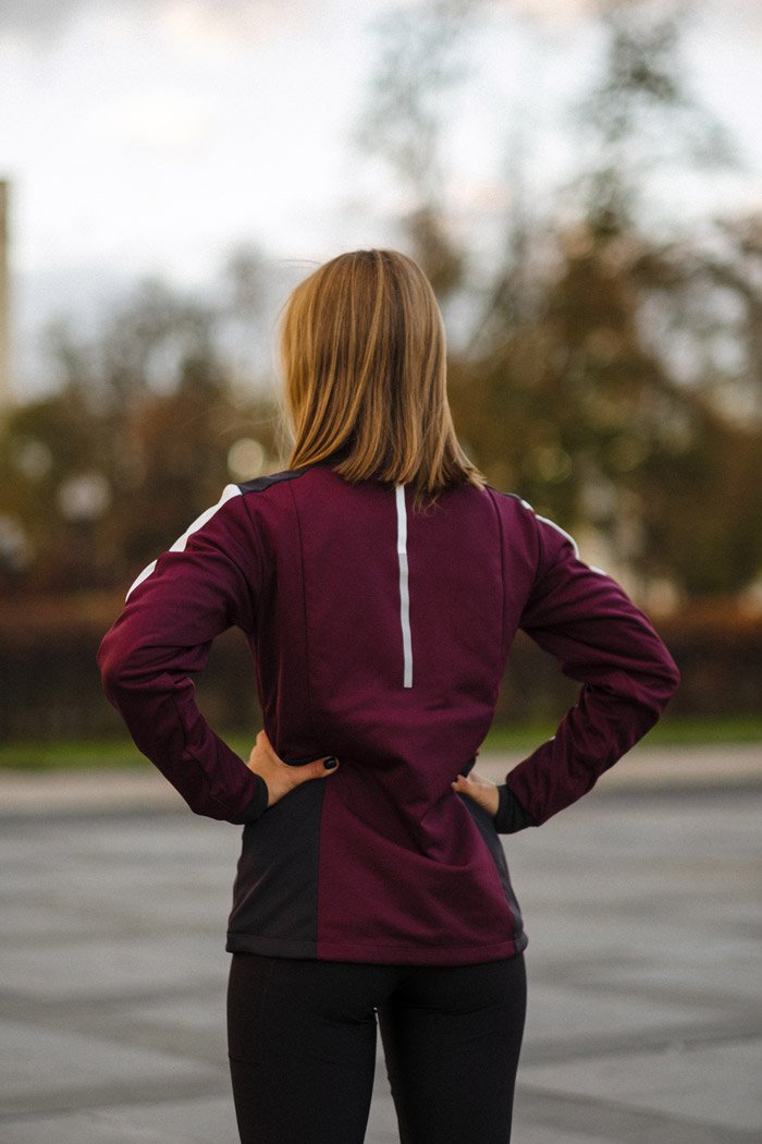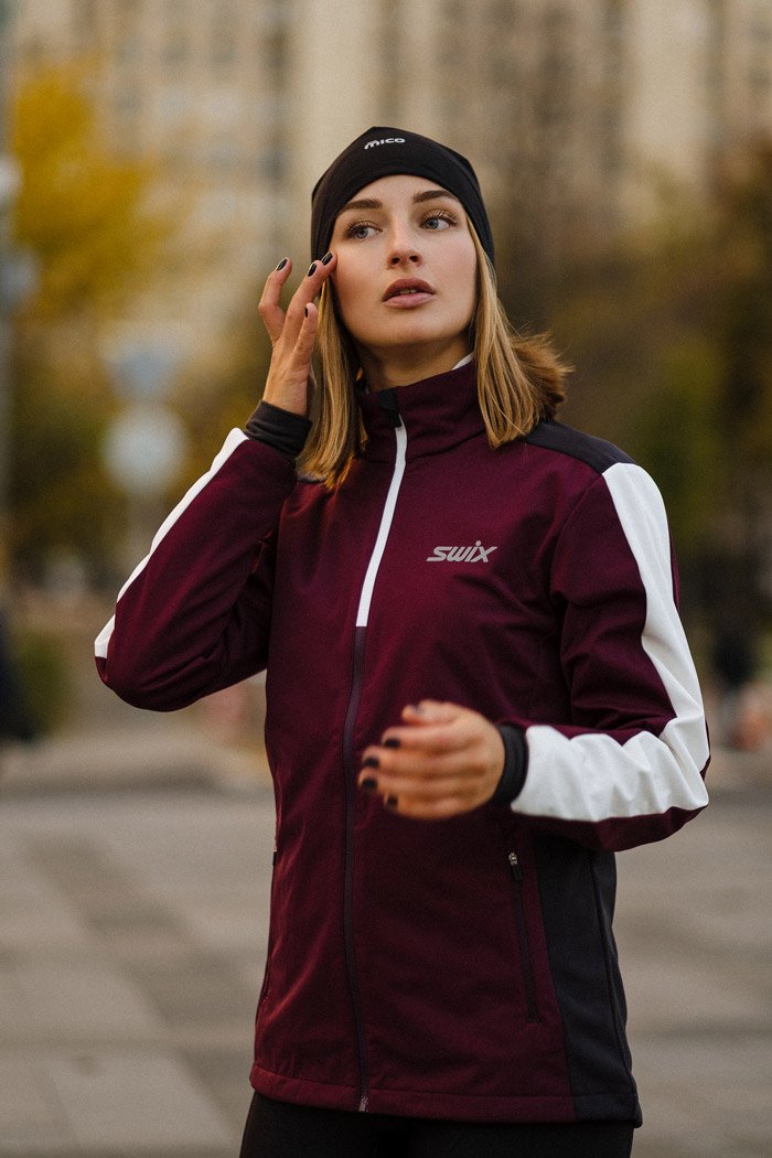 Женская разминочная куртка для катания на лыжах и бега в зимний период. Модель великолепно удерживает тепло, так как сшита из мягкого эластичного софтшелла. Перед куртки и верхняя часть рукавов располагает дышащей мембраной для защиты от ветра.
