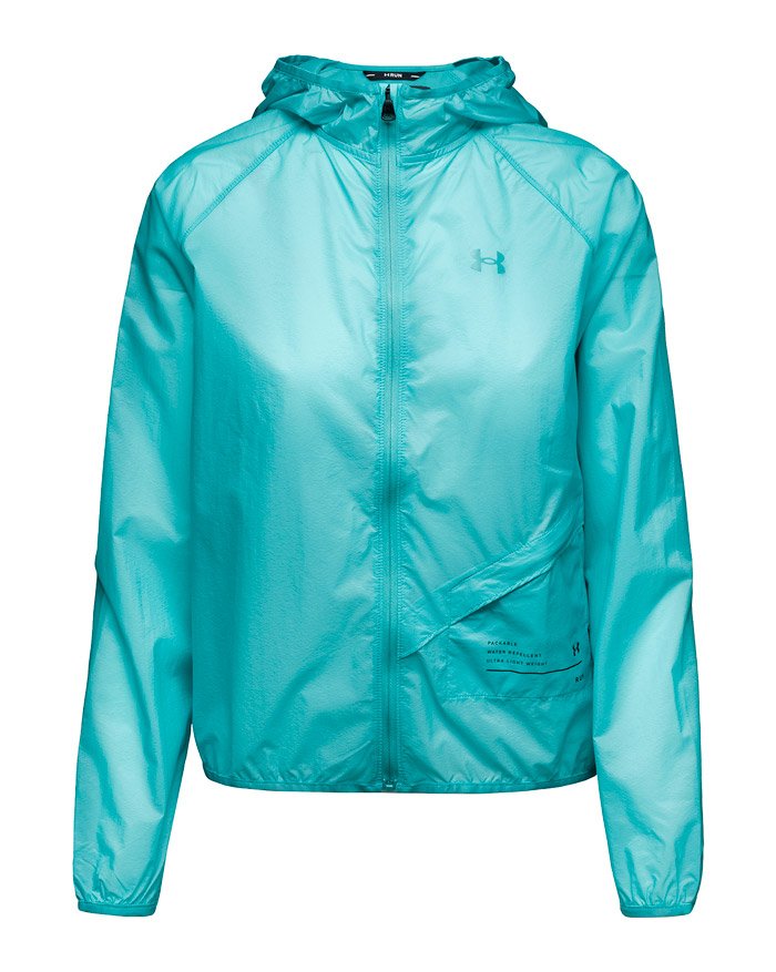 Женская куртка с капюшоном, сшита из легкой и прочной нейлоновой ткани. Предназначена для тренировок в ненастную погоду, защищает от небольшого дождя и ветра. Технология UA Storm отталкивает воду, но при этом обеспечивает необходимый воздухообмен. На спине шлица для дополнительной вентиляции.