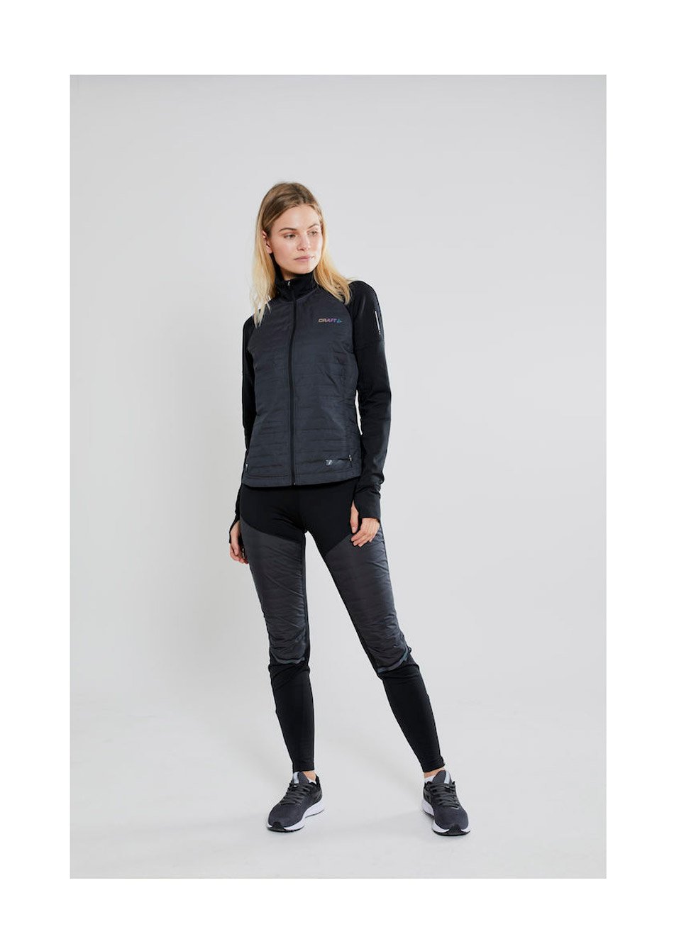 Женская куртка для бега в холодных условиях. Стеганный утеплитель в передней части куртки сохраняет тепло и защищает от ветра. Рукава и спина выполнены из мягкой трикотажной ткани, обладающей хорошей эластичостью и дышащими свойствами.