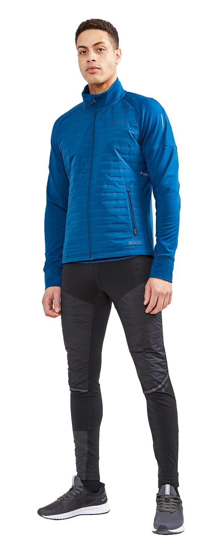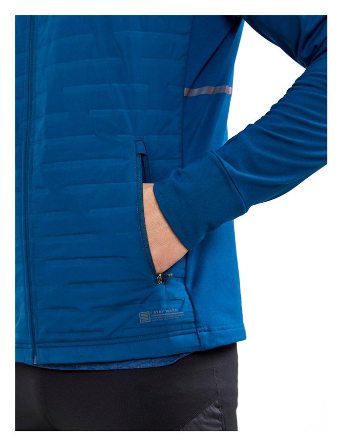 Мужская куртка для бега в холодных условиях. Стеганный утеплитель в передней части куртки сохраняет тепло и защищает от ветра. Рукава и спина выполнены из мягкой трикотажной ткани, обладающей хорошей эластичостью и дышащими свойствами.