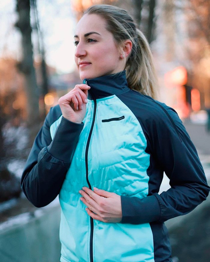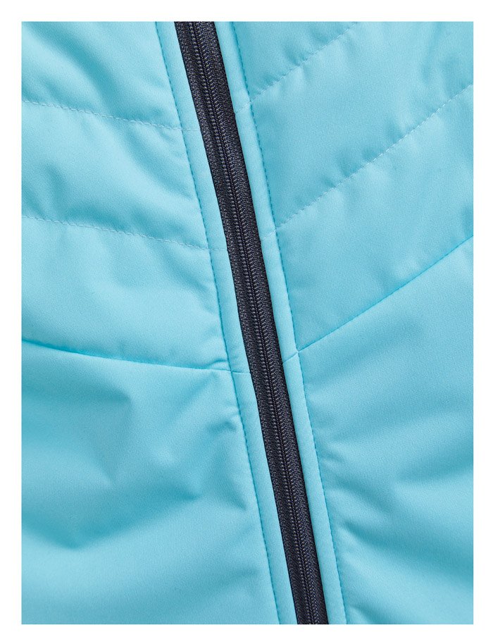 Женская куртка для катания на беговых лыжах и бега в зимний период. Впереди двойная стеганая ткань с утеплителем, поэтому модель великолепно согревает и защищает от ветра и влаги. Задняя часть куртки выполнена из эластичной дышащей ткани с начесом с внутренней стороны.