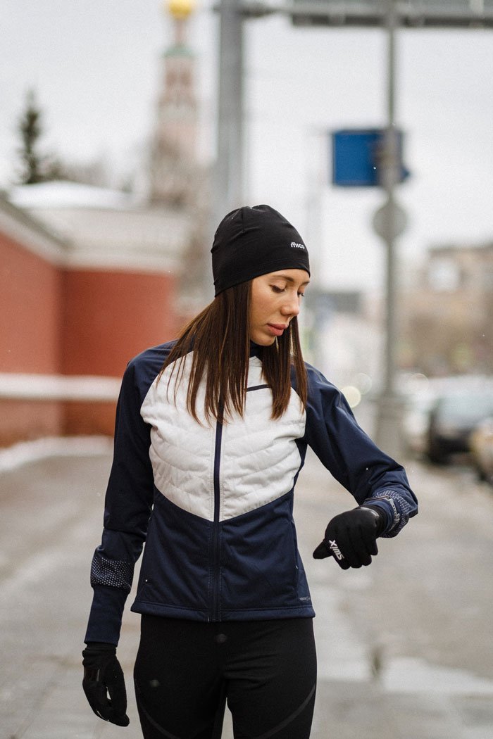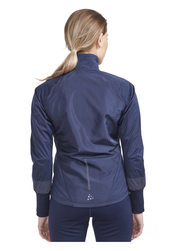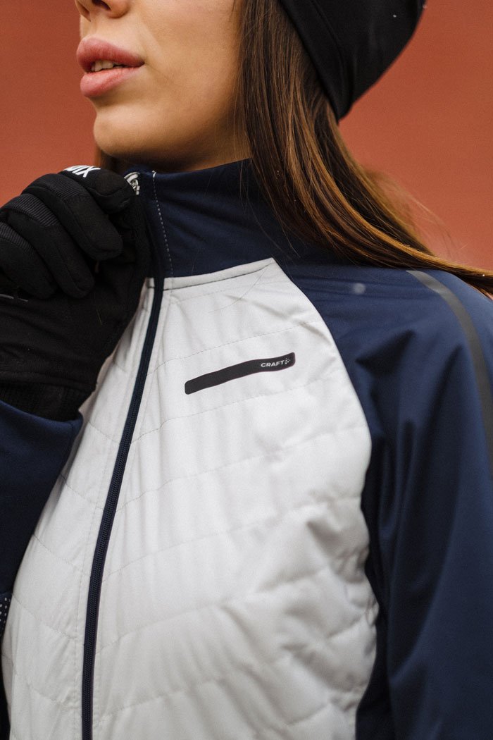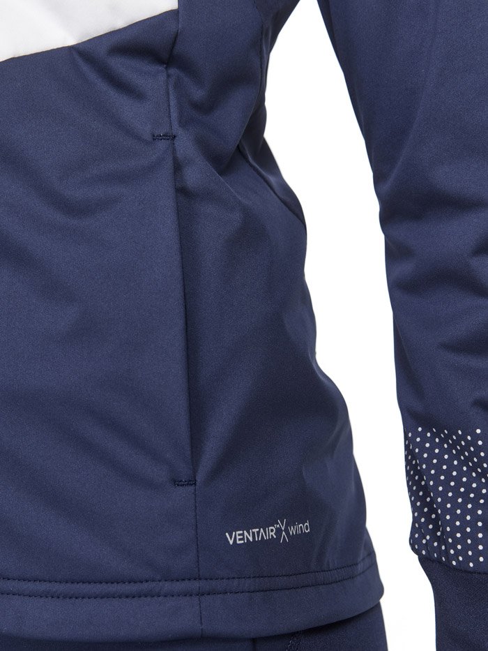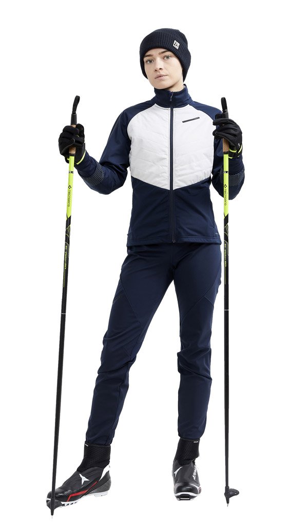 Женская куртка для катания на беговых лыжах и бега в зимний период. Впереди двойная стеганая ткань с утеплителем, поэтому модель великолепно согревает и защищает от ветра и влаги. Задняя часть куртки выполнена из эластичной дышащей ткани с начесом с внутренней стороны.