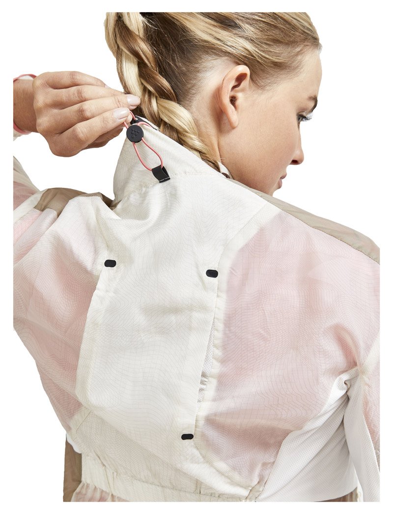 На воротнике сзади расположен ремешок, который позволяет регулировать посадку. Куртка удобно складывается в собственный карман и не занимает много места при транспортировке.