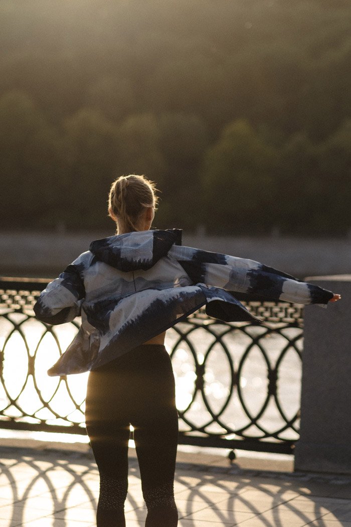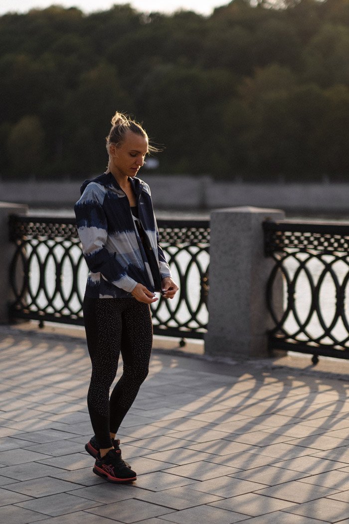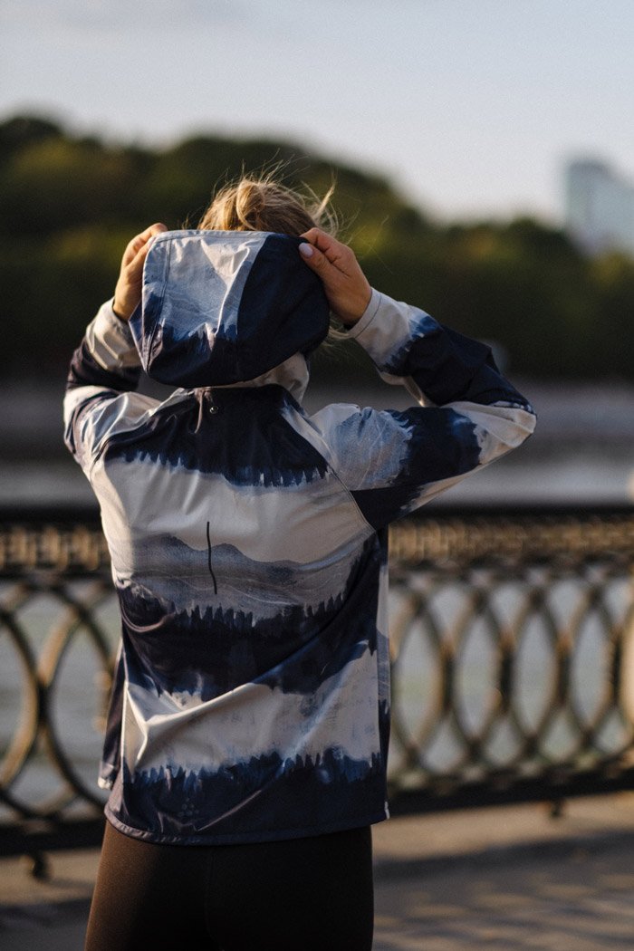Регулируемый капюшон оснащен удобным ремешком для надежной фиксации. Светоотражающие элементы повышают безопасность тренировок в темное время суток.