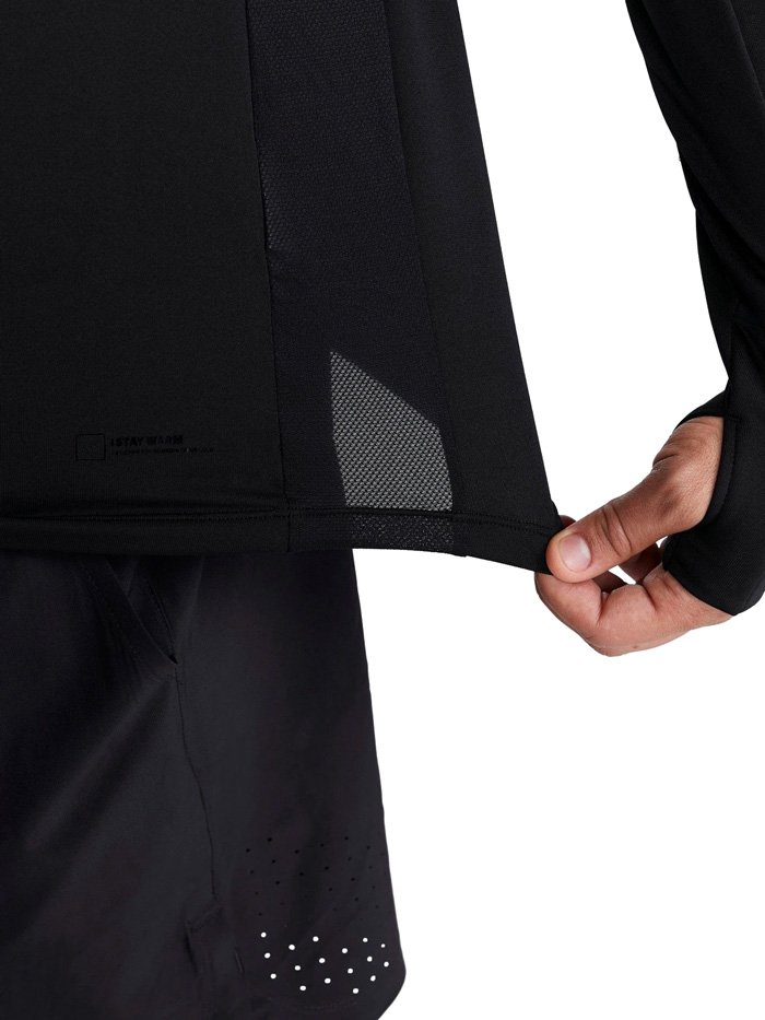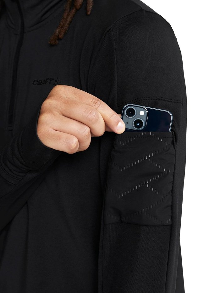 Кофта изготовлена из переработанного полиэстера, утепленного флисовым слоем с внутренней стороны. Сетчатые вставки подмышками и в области шеи способствуют отводу излишней влаги и улучшенной вентиляции. Молния до середины груди с внутренней планкой защищает шею от натирания, а высокий воротник сохраняет дополнительное тепло. Манжеты с отверстиями для большого пальца защищают кисти от холода. На левом рукаве размещен карман для хранения ключей или карточек.
