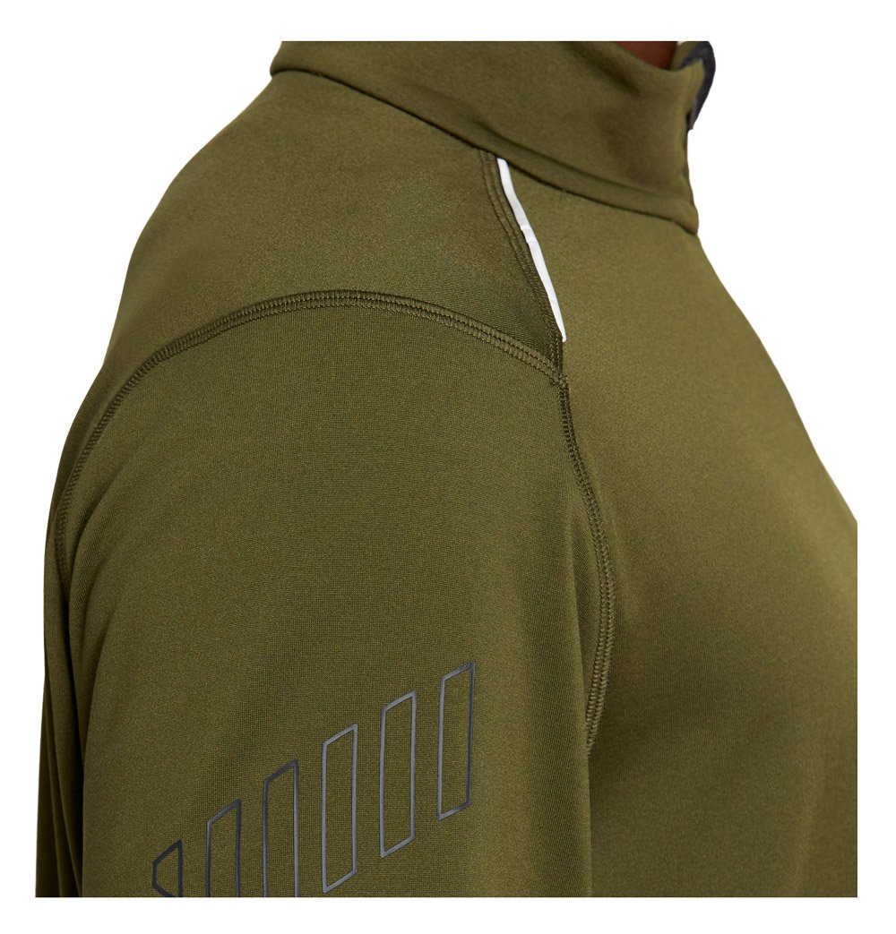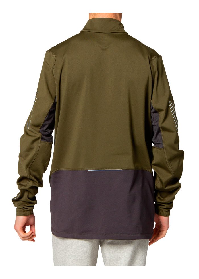 Высокий воротник сохраняет тепло, молния до середины груди позволяет регулировать вентиляцию. Внизу рукавов отверстия для больших пальцев. Плоские швы не натирают кожу. Светоотражающие элементы повышают видимость в темное время суток.