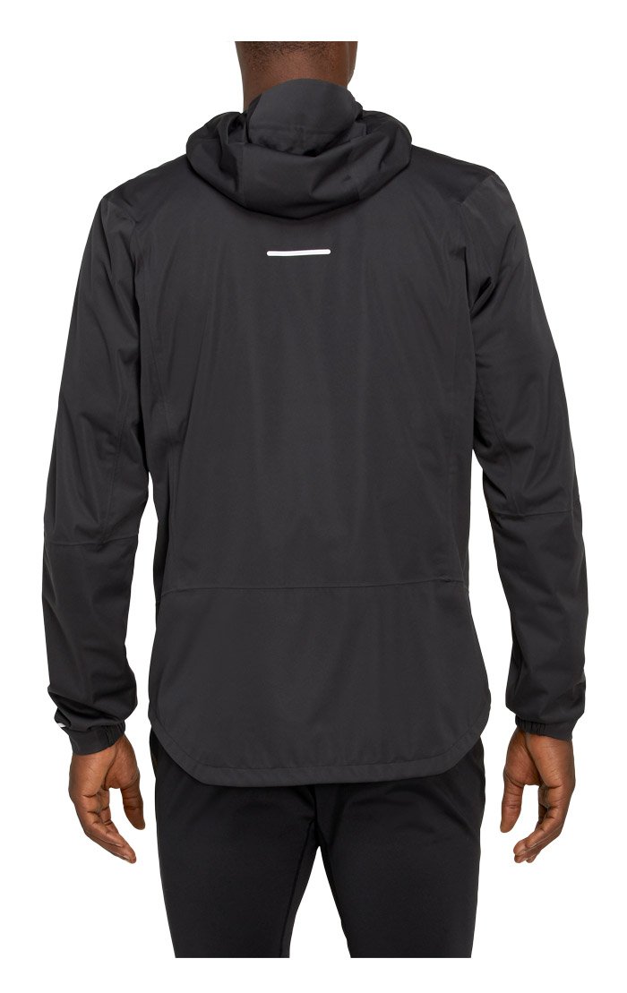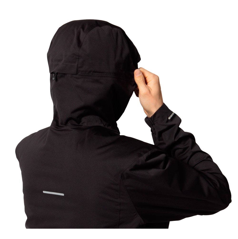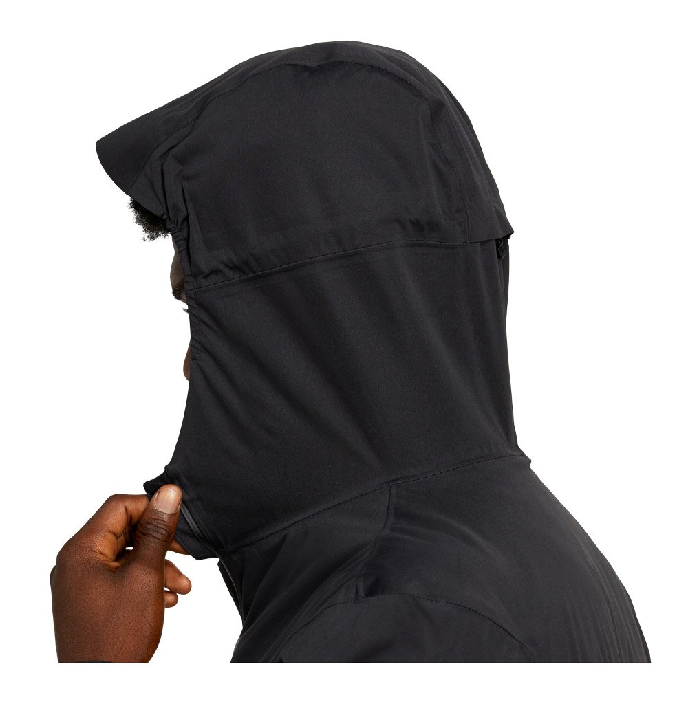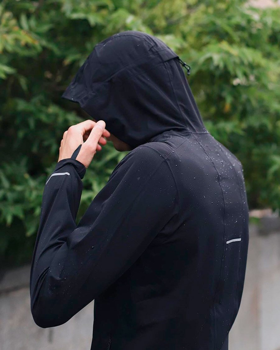 Мужская куртка с капюшоном для бега зимой и в межсезонье. Защищает от снега, дождя и ветра, так как изготовлена из водонепроницаемой и ветронепродуваемой ткани.