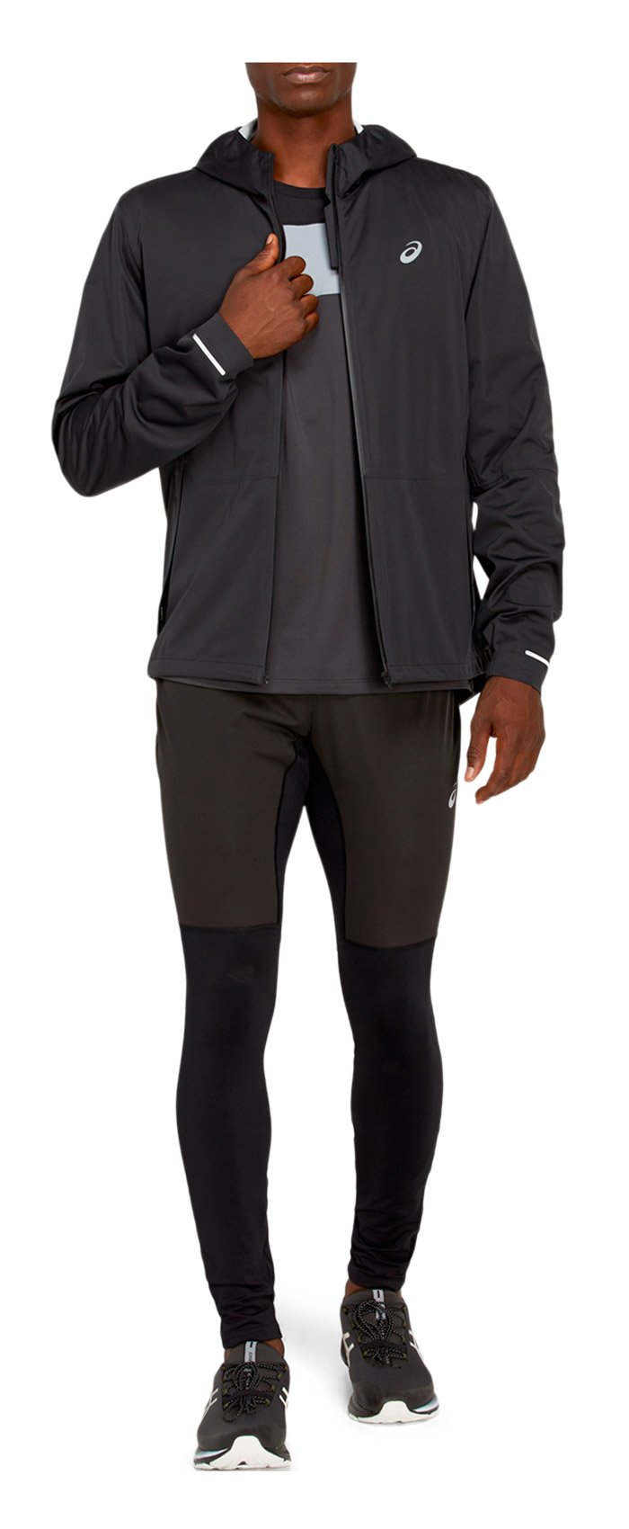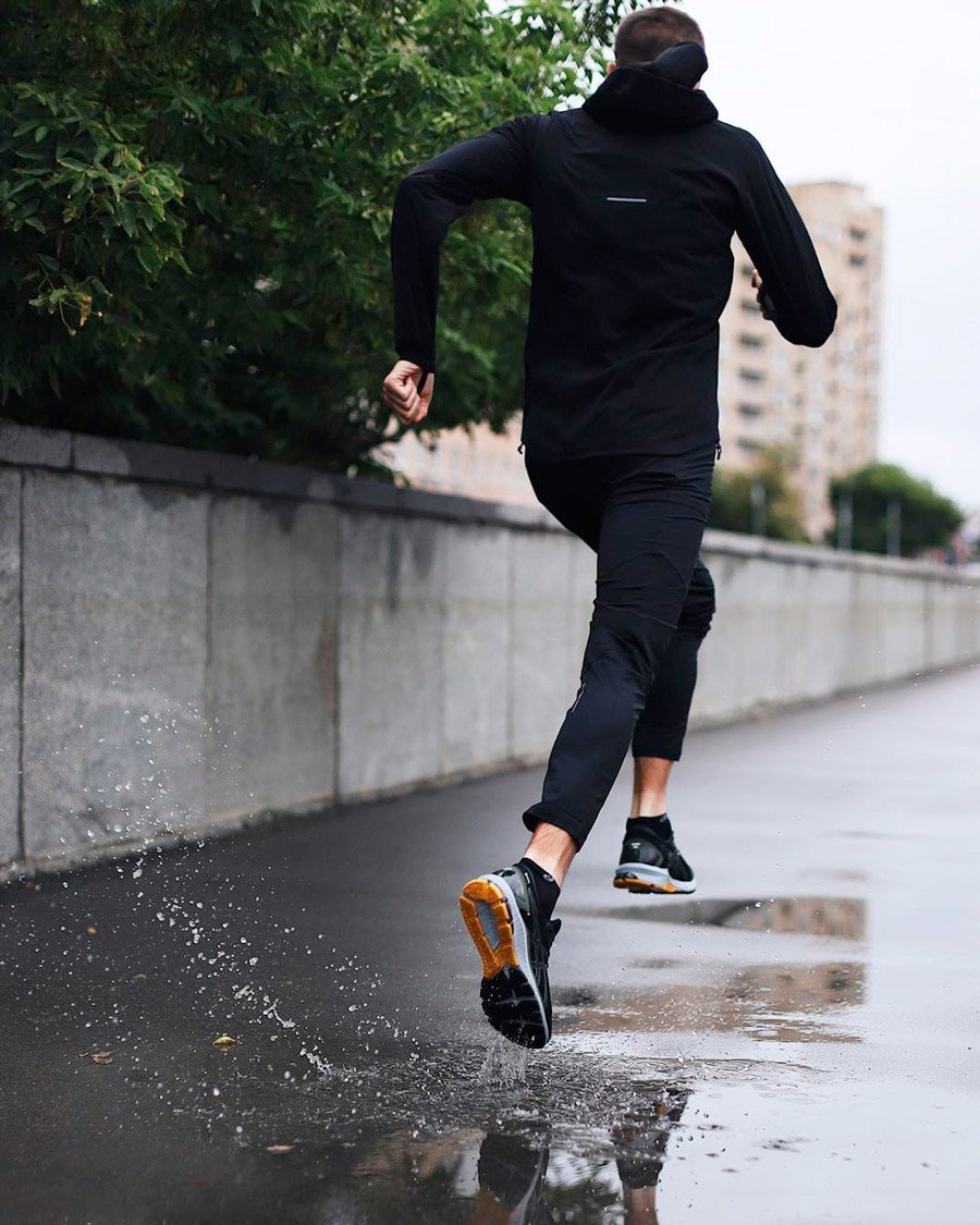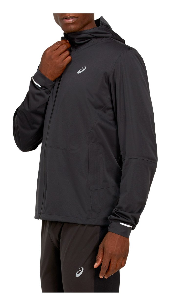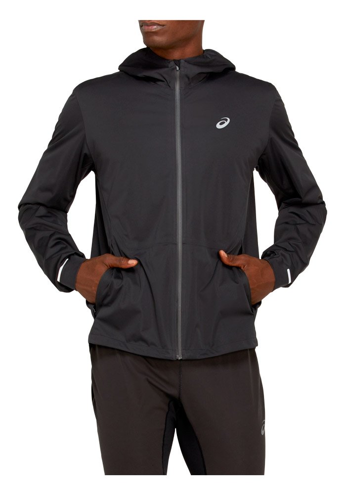 Мужская куртка с капюшоном для бега зимой и в межсезонье. Защищает от снега, дождя и ветра, так как изготовлена из водонепроницаемой и ветронепродуваемой ткани.