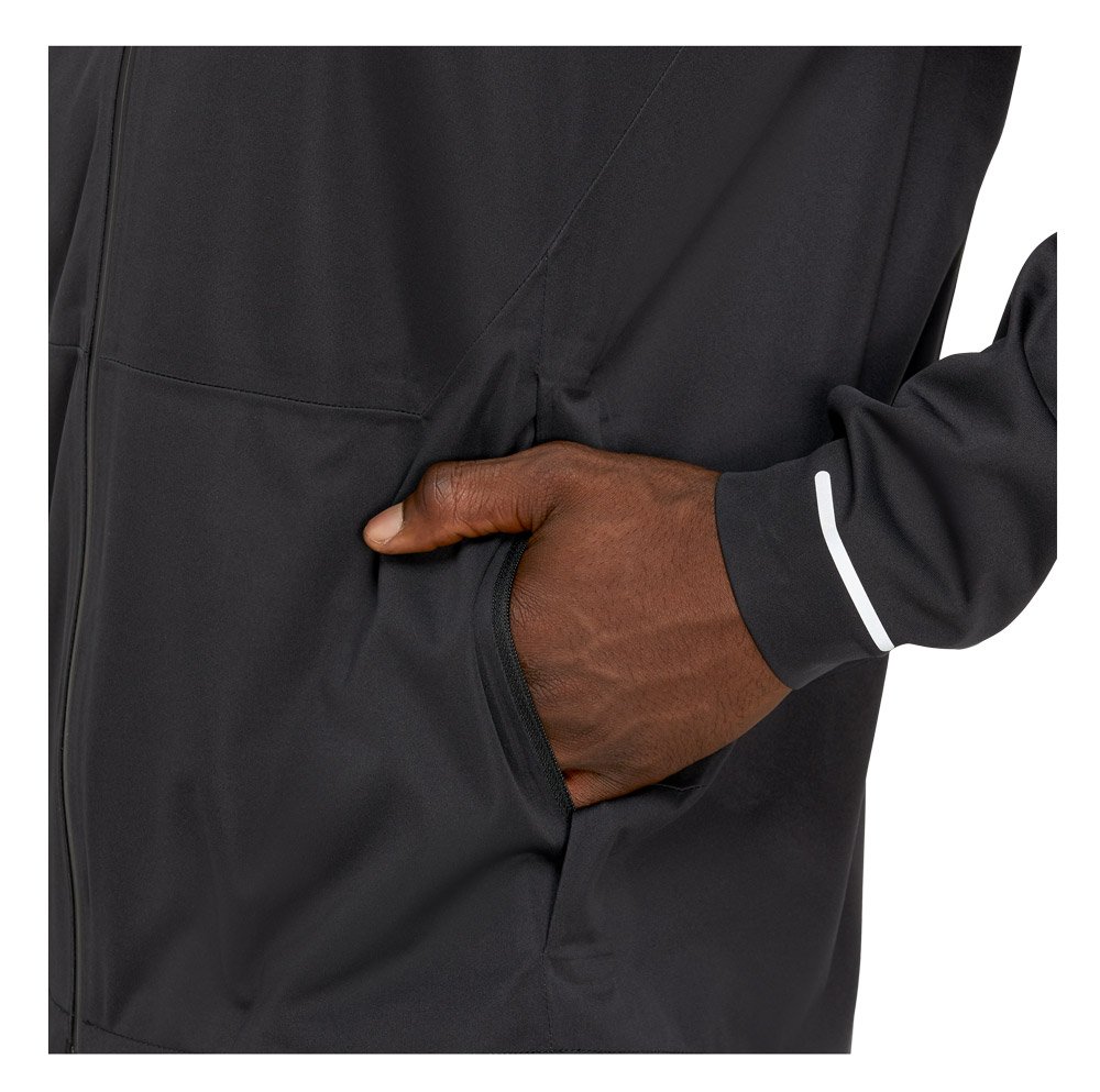 Манжеты с внутренней стороны собраны на резинку для защиты от ветра. По бокам карманы на молнии для мелочей. Низ куртки затягивается на кулиску. Светоотражающие элементы для безопасных тренировок в темное время суток.
