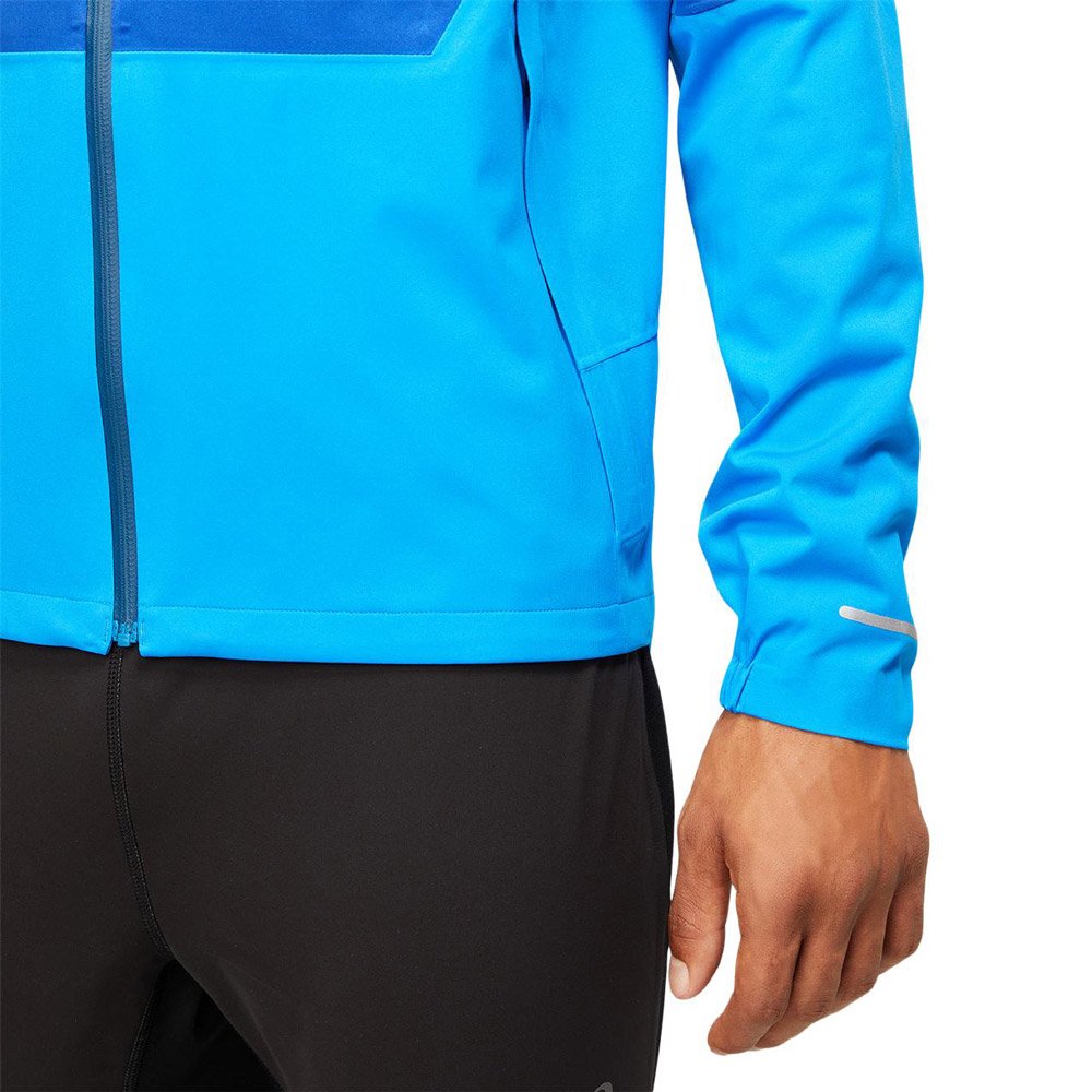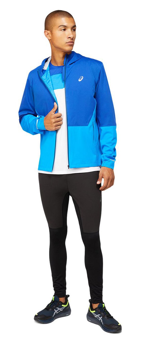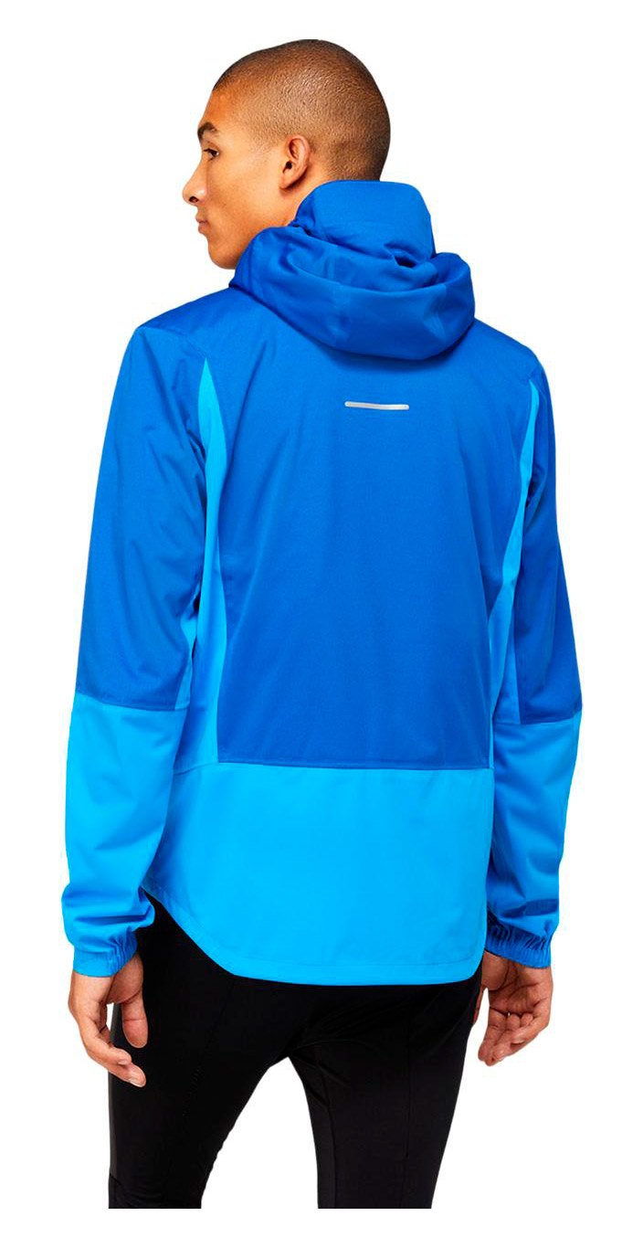 Манжеты с внутренней стороны собраны на резинку для защиты от ветра. По бокам карманы на молнии для мелочей. Низ куртки затягивается на кулиску. Светоотражающие элементы для безопасных тренировок в темное время суток.