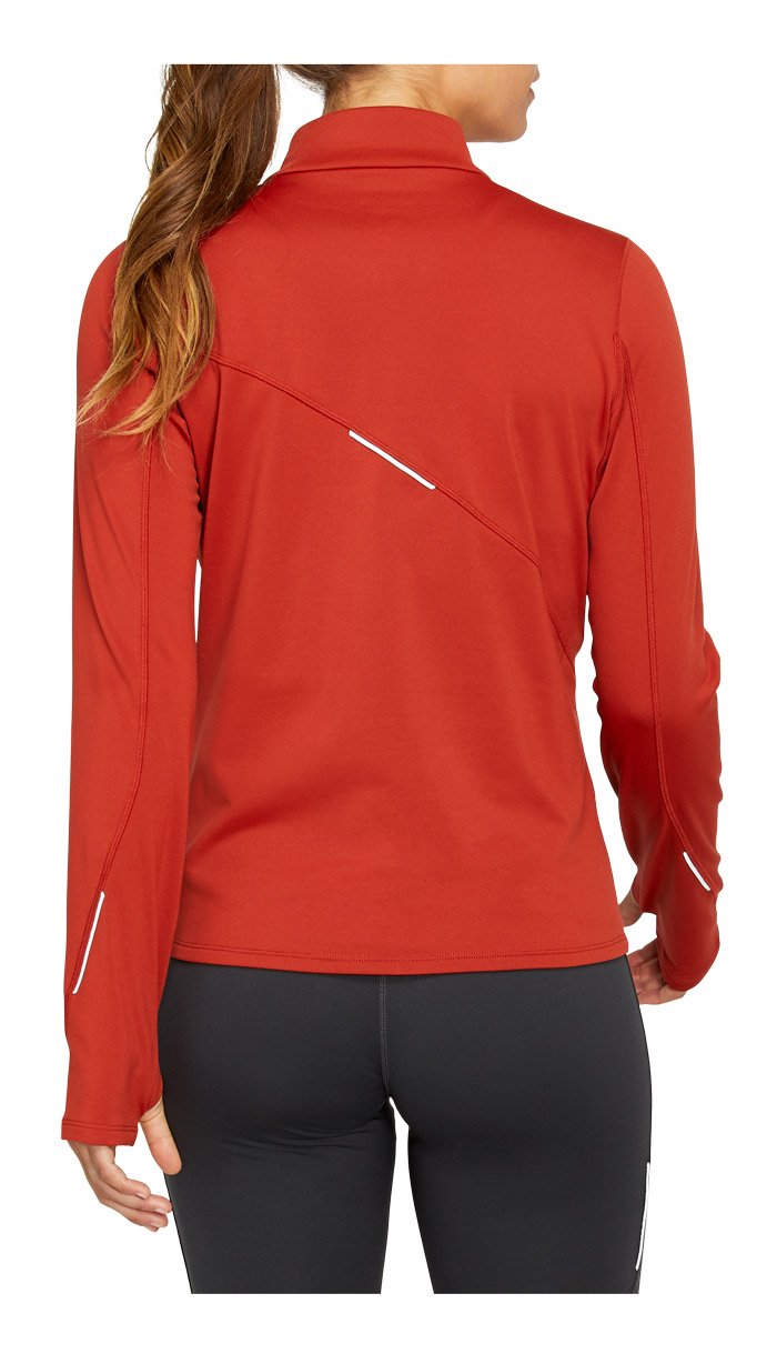 Теплая кофта из плотной трикотажной ткани для бега в холодную погоду. Модель приталенного кроя с высоким воротником и молнией до середины груди для вентиляции.