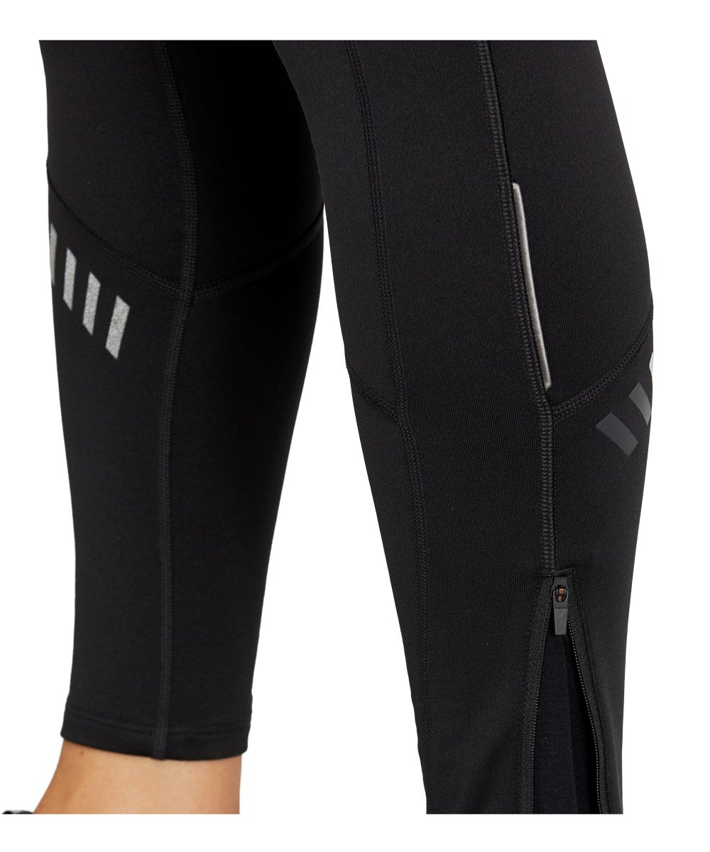 Женские утепленные тайтсы из плотной ткани с флисом с изнаночной стороны. Спереди и сзади светоотражающие элементы для безопасных тренировок в темное время суток.
