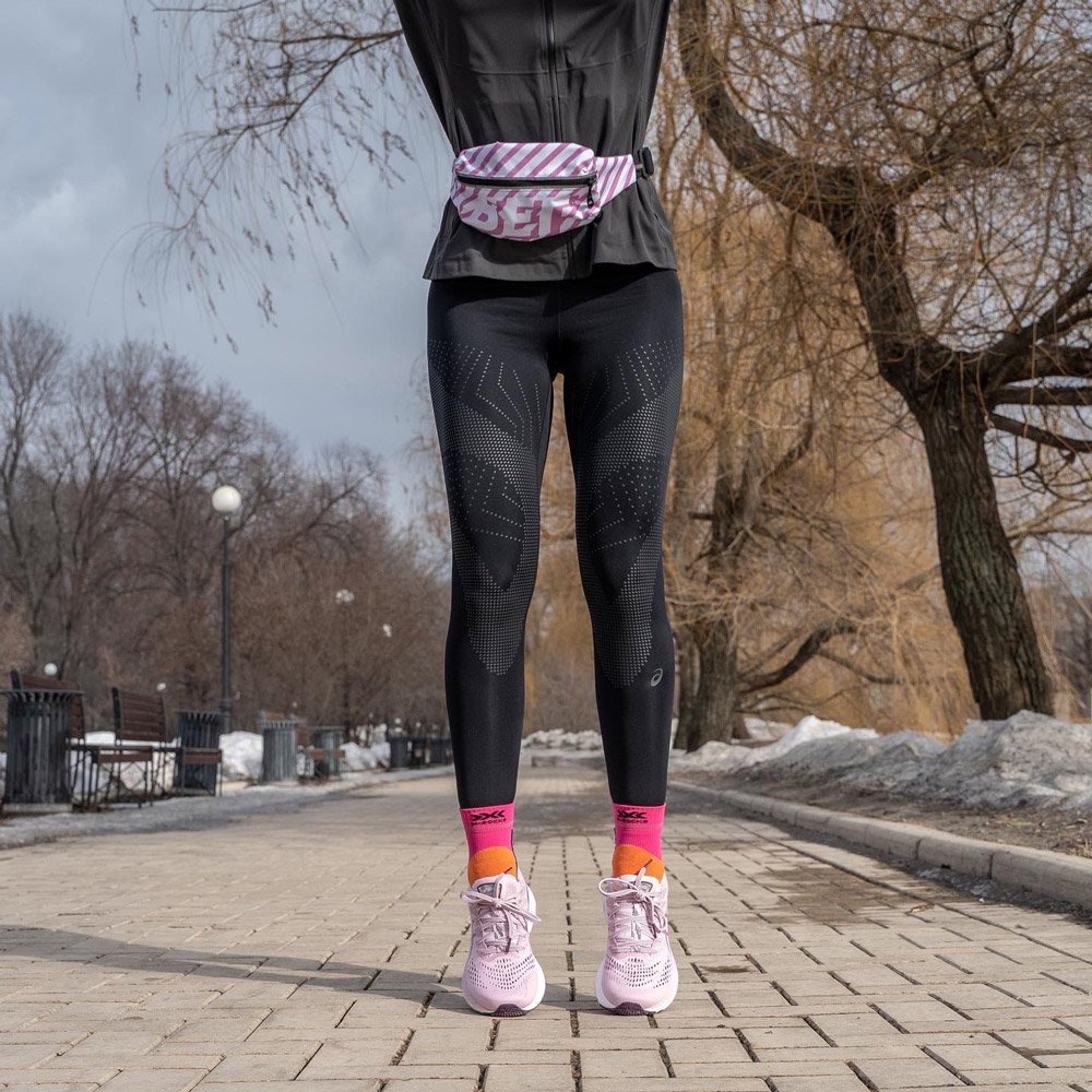 Беговые тайтсы выполнены из легкой и эластичной ткани, которая обеспечивает необходимую свободу движений и мягкую поддержку мышц. Материал легко отводит влагу от тела и быстро сохнет. На поясе предусмотрен карман для телефона.