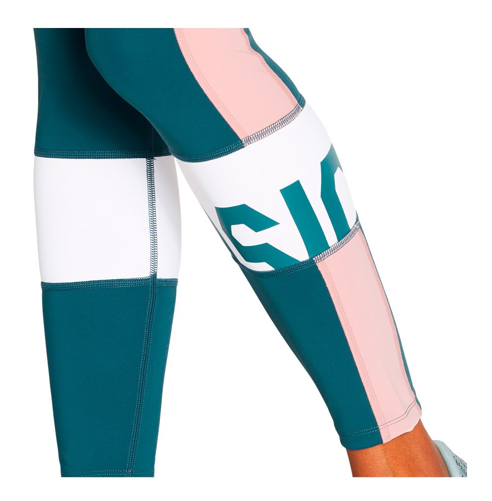 Женские тайтсы для бега и фитнеса, выполненные в стиле колор-блок. Модель сшита из эластичного, хорошо дышащего и отводящего влагу трикотажа.