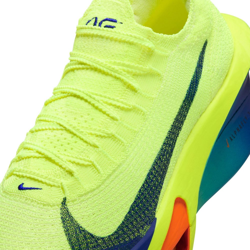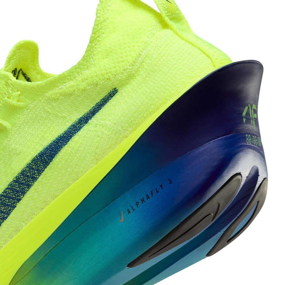 Третье поколение Alphafly стало легче предшественников, а углеродная пластина получила увеличенную ширину. Верх выполнен из инновационного материала AtomKnit - лёгкого, эластичного и воздухопроницаемого, который точно облегает стопу, обеспечивая надёжную фиксацию и хорошую вентиляцию. Встроенный вязаный язычок с мягкой подкладкой равномерно распределяет давление шнуровки, повышая комфорт.