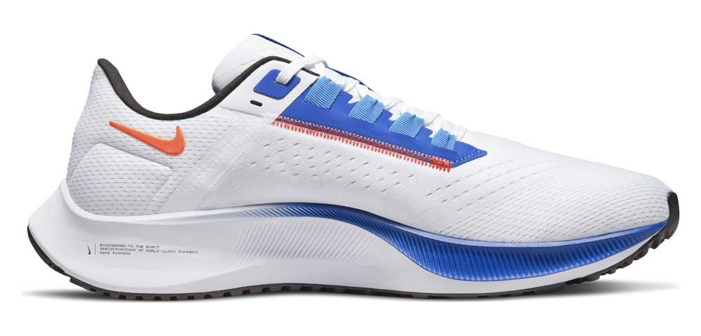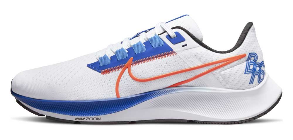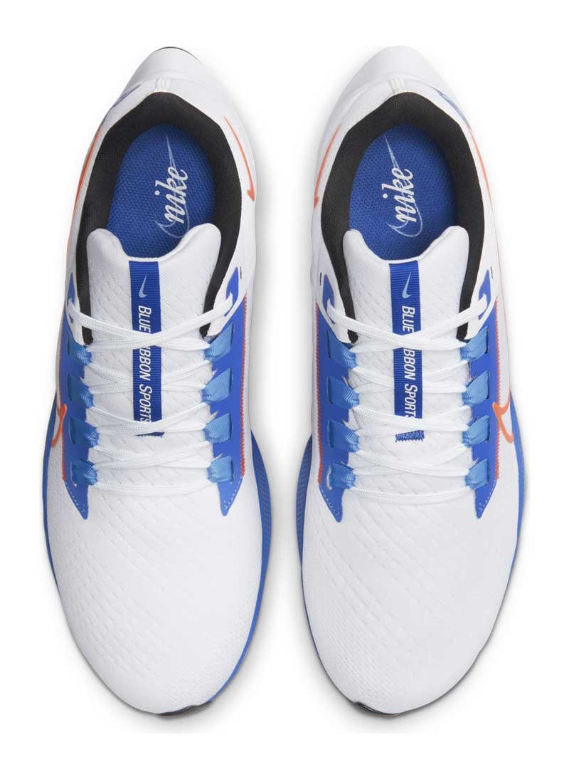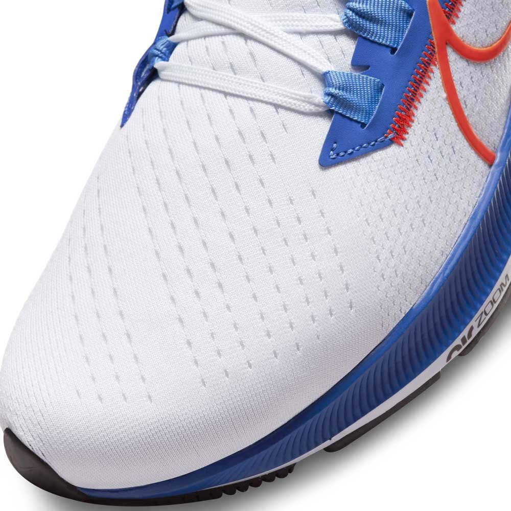 Верх в Pegasus 38 представляет собой легкую воздухопроницаемую сетку со специальным плетением, которое регулируется при шнуровке, надежно фиксирует стопу и при этом не ограничивает ее движений. Дополнительный комфорт создается при помощи широкого носка, а швы в верхней части делают посадку более удобной и придают классической модели современный в