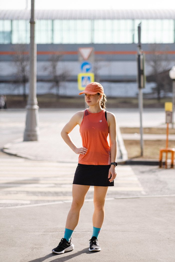 Стильная женственная юбка для беговых тренировок и соревнований. Передняя часть выполнена из легкой ветрозащитной тафты, а задняя часть - из воздухопроницаемого эластичного микроволокна. Внутри размещены спринтеры из устойчивой к истиранию микрофибры. Широкий пояс оснащен двумя сетчатыми карманами, в которых удобно хранить ключи и другие мелочи. Шнурок с внутренней стороны позволяет регулировать посадку.