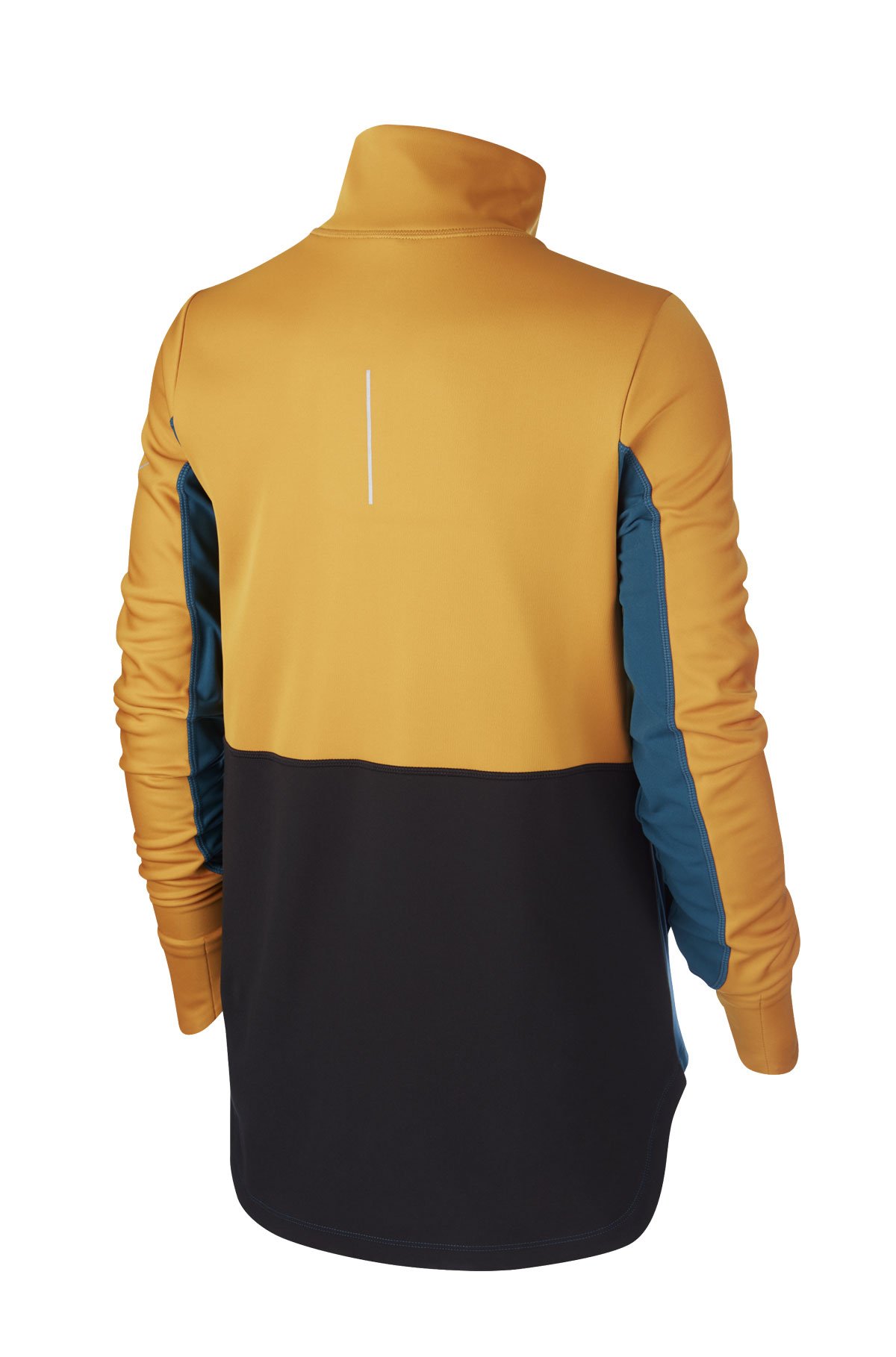 Женская кофта для бега с молнией на половину длины. Дизайн модели предусматривает специальный крой, защищающий от холода - высокий воротник, удлиненная спинка, митенки на рукавах.