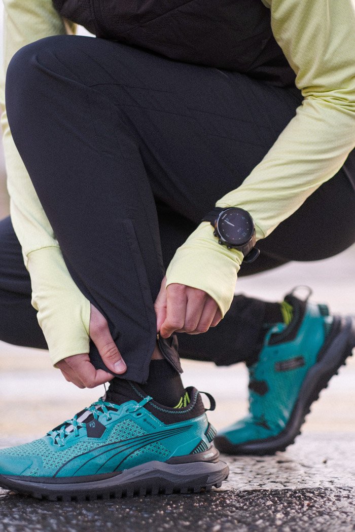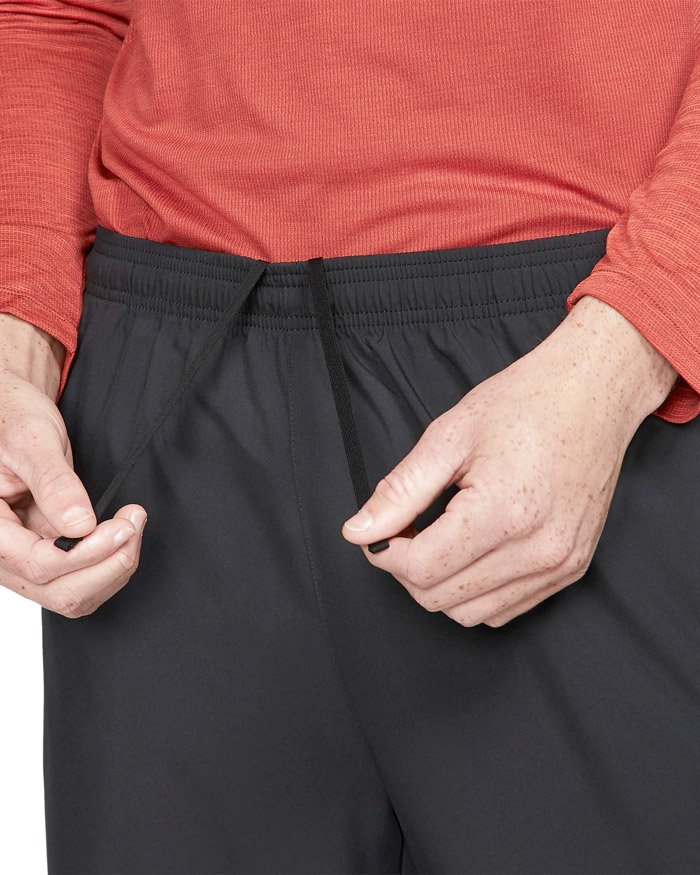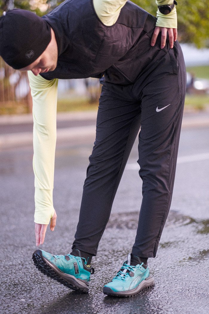 По бокам расположены карманы, в которых можно хранить необходимые на пробежке мелочи. Пояс оснащен шнурком для регулировки посадки по фигуре. Молнии на щиколотках позволяют легко надевать и снимать брюки.