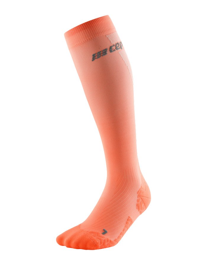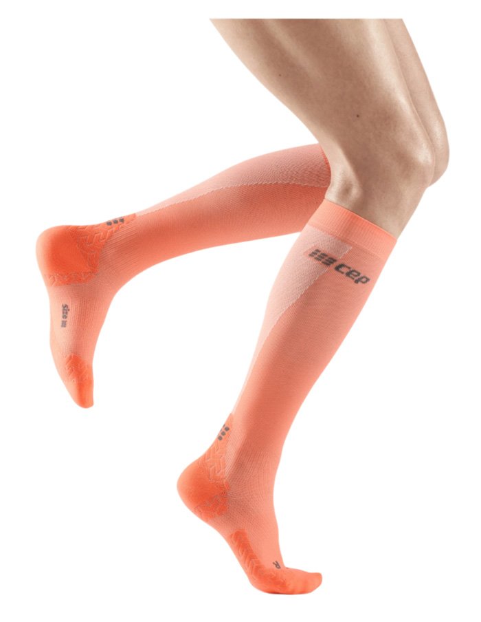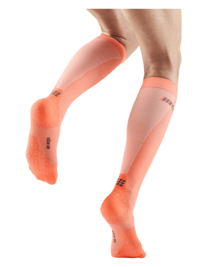 Ультратонкие гольфы CEP подходят для интенсивных тренировок. Градуированная спортивная компрессия способствует улучшению тонуса мышц и ускорению кровообращения. Применение технологии Smart Carbon позволило сделать эту модель на 30% легче базовой. Гольфы точно повторяют форму ноги и создают уверенное сцепление с обувью. Внедрение карбона в структуру нити обеспечивает охлаждающий эффект, что особенно важно при интенсивных тренировках.