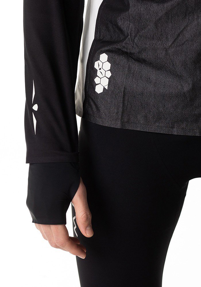 Вшитые рукавицы с прорезью для большого пальца обеспечивают тепло, а небольшой карман на заднем бедре позволяет захватить на пробежку необходимые мелочи. В кофте использован метод бесшовной ультразвуковой сварки для исключения натирания и раздражения кожи. Светоотражающие элементы повышают видимость в условиях низкой освещенности.