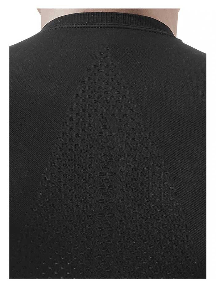 На спине и в области предплечий предусмотрена лазерная перфорация и сетчатые вставки для дополнительной вентиляции. Гидрофильная обработка и особая структура ткани обеспечивают быстрый отвод влаги с поверхности тела и дарят приятный охлаждающий эффект.