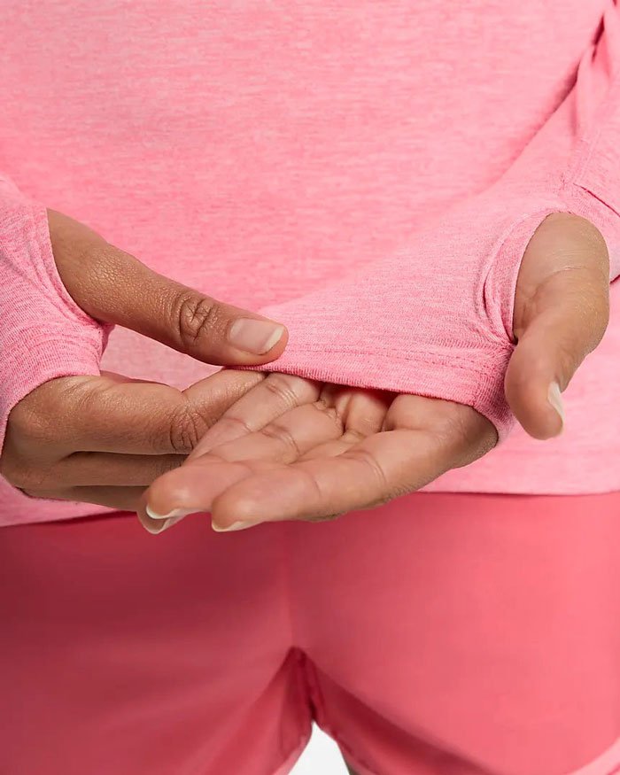 Модель хорошо отводит влагу, так как сшита из технологичной ткани Dry-Fit. Внизу рукавов прорези для больших пальцев, которые удерживают рукава на месте. Сбоку карман с клапаном для хранения мелочей.
