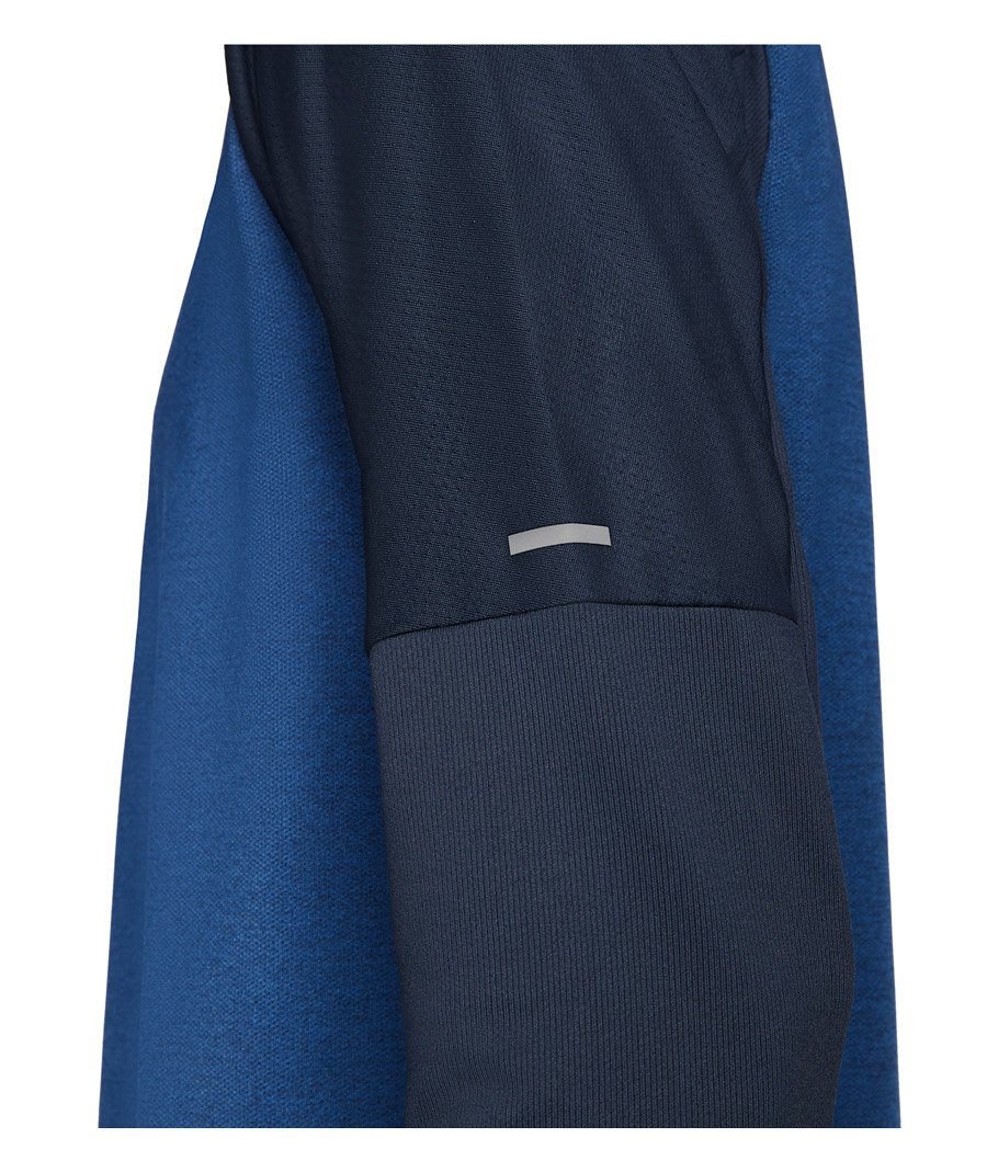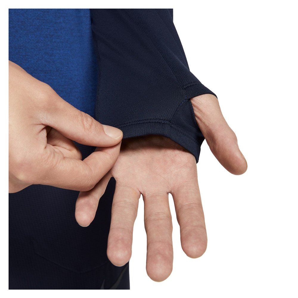 Кофта прекрасно справляется с выводом влаги, потому что сшита из технологичной ткани Dry-Fit. Эту модель отличают хорошие дышащие свойства, плечи и верхняя часть рукавов выполнены из сетчатого материала, молния до середины груди позволяет регулировать вентиляцию. Внизу рукавов прорези для больших пальцев, удерживают рукава на месте.