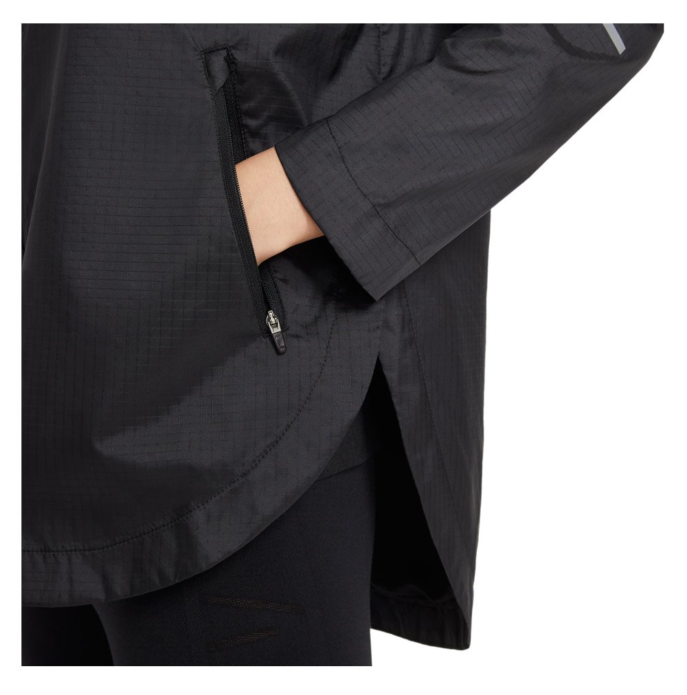 Эта модель женской куртки создана специально для пробежек в ненастную погоду. Ткань с водоотталкивающим покрытием и капюшон, состоящий из трех панелей, надежно защищают от дождя даже во время длительного кросса.